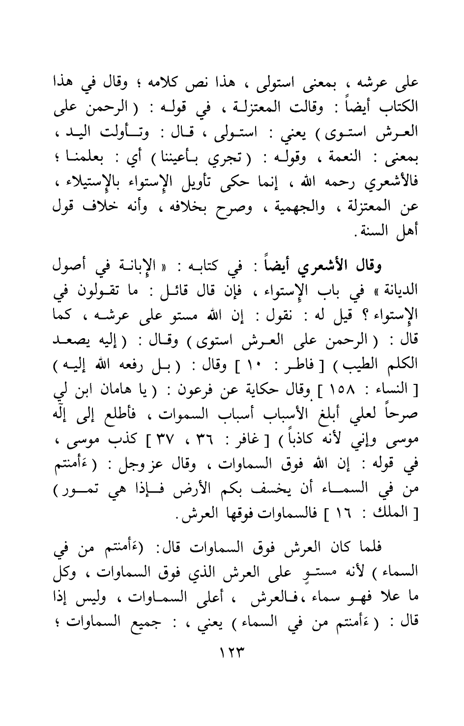 وقال الأشعري أيضا: في كتابه: الإبانة، في أصول الديانة في باب الاستواء: فإن قال قائل: ما تقولون في الاستواء؟ قيل له: نقول: إن الله مستو على عرشه كما قال: {الرَّحْمَنُ عَلَى الْعَرْشِ اسْتَوَى} [سورة طه آية: 5] ، وقال: {إِلَيْهِ يَصْعَدُ الْكَلِمُ الطَّيِّبُ} [سورة فاطر آية: 10] ، وقال: {بَلْ رَفَعَهُ اللَّهُ إِلَيْهِ} [سورة النساء آية: 158] ، وقال حكاية عن فرعون: {يَا هَامَانُ ابْنِ لِي صَرْحاً لَعَلِّي أَبْلُغُ الْأَسْبَابَ أَسْبَابَ السَّمَاوَاتِ فَأَطَّلِعَ إِلَى إِلَهِ مُوسَى وَإِنِّي لَأَظُنُّهُ كَاذِباً} [سورة آية: 36-37] كذب موسى، في قوله: إن الله فوق السماوات، وقال عز وجل: {أَأَمِنْتُمْ مَنْ فِي السَّمَاءِ أَنْ يَخْسِفَ بِكُمُ الْأَرْضَ فَإِذَا هِيَ تَمُورُ} [سورة الملك آية: 16] ، فالسماوات فوقها العرش.