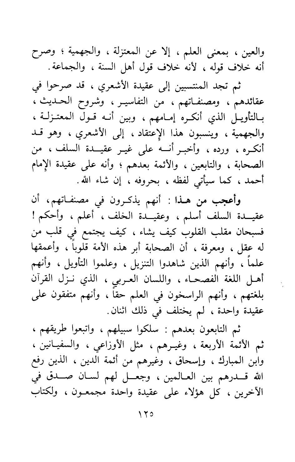 ثم التابعون بعدهم سلكوا سبيلهم، واتبعوا طريقهم، ثم الأئمة الأربعة وغيرهم مثل الأوزاعي، والسفيانين، وابن المبارك، وإسحاق، وغيرهم من أئمة الدين الذين رفع الله قدرهم بين العالمين، وجعل لهم لسان صدق في الآخرين، كل هؤلاء على عقيدة واحدة مجمعون، ولكتاب