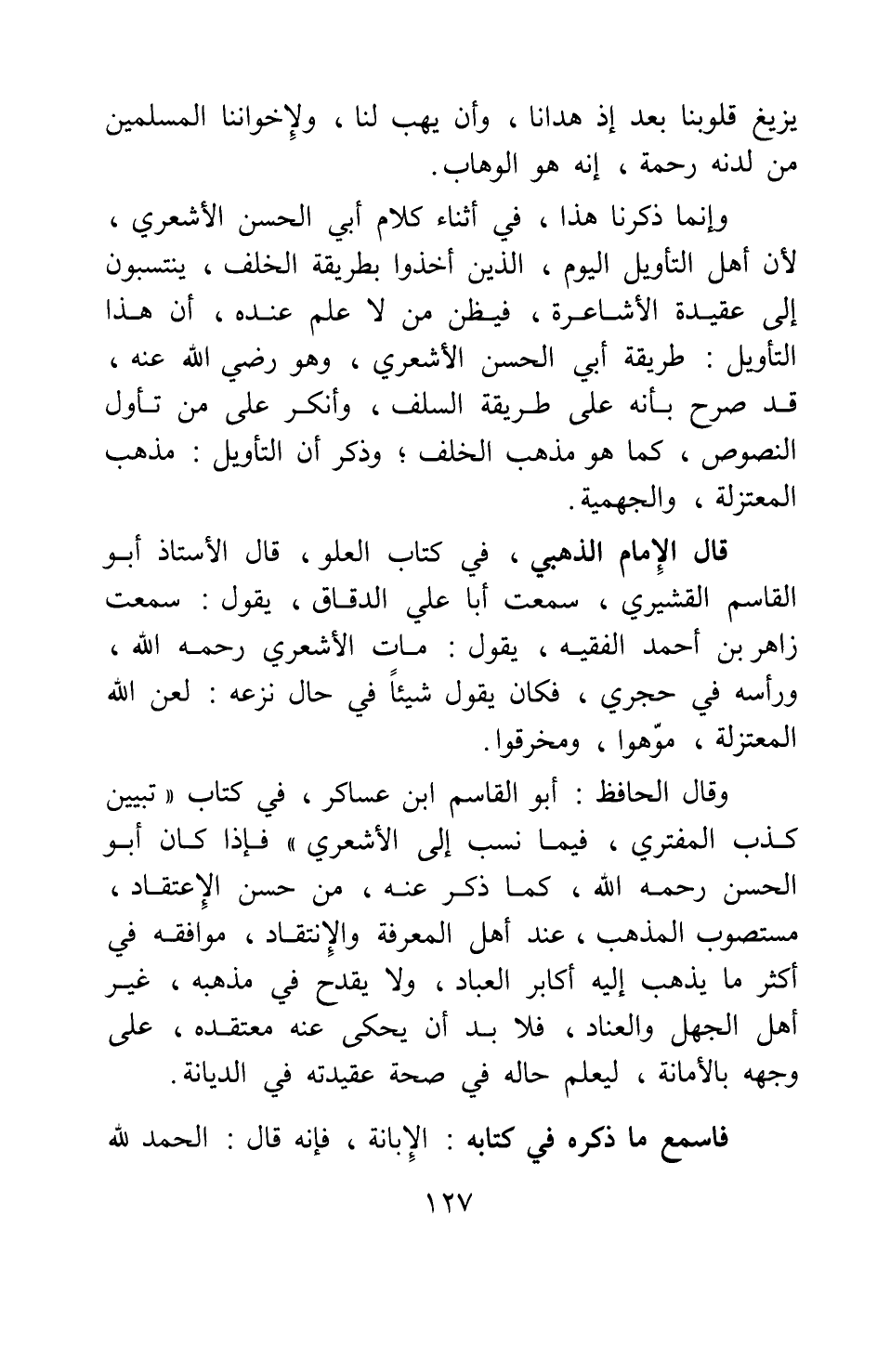 وقال الحافظ أبو القاسم ابن عساكر، في كتاب تبيين كذب المفتري فيما نسب إلى الأشعري: فإذا كان أبو الحسن رحمه الله كما ذكر عنه من حسن الاعتقاد، مستصوب المذهب عند أهل المعرفة والانتقاد، موافقه في أكثر ما يذهب إليه أكابر العباد، ولا يقدح في مذهبه غير أهل الجهل والعناد، فلا بد أن يحكى عنه معتقده على وجهه بالأمانة، ليعلم حاله في صحة عقيدته في الديانة.