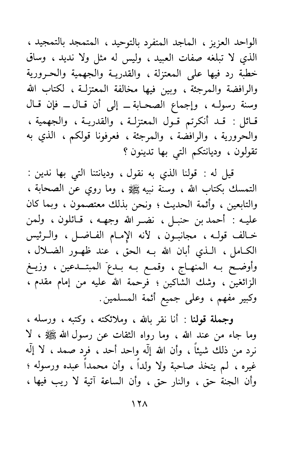 وجملة قولنا: أنا نقر بالله، وملائكته، وكتبه، ورسله، وما جاء من عند الله، وما رواه الثقات عن رسول الله صلى الله عليه وسلم، لا نرد من ذلك شيئا، وأن الله إله واحد أحد، فرد صمد، لا إله غيره، لم يتخذ صاحبة ولا ولدا، وأن محمدا عبده ورسوله; وأن الجنة حق، والنار حق، وأن الساعة آتية لا ريب فيها،
