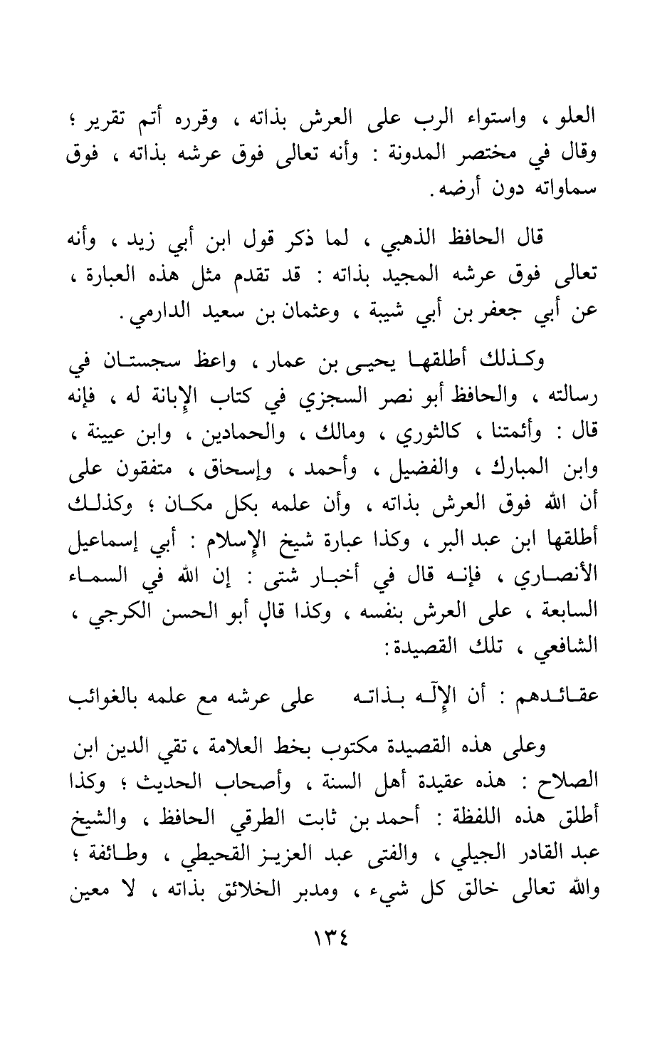 قال الحافظ الذهبي، لما ذكر قول ابن أبي زيد: وأنه تعالى فوق عرشه المجيد بذاته، قد تقدم مثل هذه العبارة، عن أبي جعفر بن أبي شيبة، وعثمان بن سعيد الدارمي. وكذلك أطلقها يحيى بن عمار، واعظ سجستان في رسالته، والحافظ أبو نصر السجزي في كتاب الإبانة له، فإنه قال: وأئمتنا كالثوري، ومالك، والحمادين، وابن عيينة، وابن المبارك، والفضيل، وأحمد، وإسحاق، متفقون على أن الله فوق العرش بذاته، وأن علمه بكل مكان; وكذلك أطلقها ابن عبد البر، وكذا عبارة شيخ الإسلام: أبي إسماعيل الأنصاري، فإنه قال في أخبار شتى: إن الله في السماء السابعة، على العرش بنفسه، وكذا قال أبو الحسن الكرجي، الشافعي، تلك القصيدة: