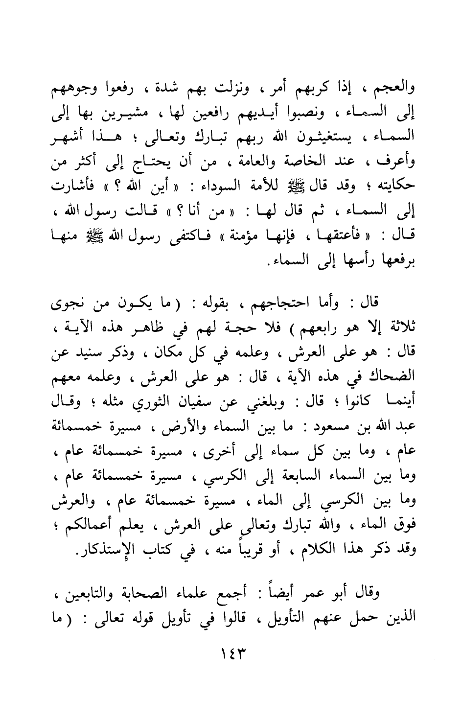 والعجم، إذا كربهم أمر ونزلت بهم شدة، رفعوا وجوههم إلى السماء، ونصبوا أيديهم رافعين لها، مشيرين بها إلى السماء، يستغيثون الله ربهم تبارك وتعالى; هذا أشهر وأعرف عند الخاصة والعامة، من أن يحتاج إلى أكثر من حكايته; وقد " قال صلى الله عليه وسلم للأمة السوداء: أين الله؟ فأشارت إلى السماء، ثم قال لها: من أنا؟ قالت رسول الله، قال: فأعتقها، فإنها مؤمنة "1 فاكتفى رسول الله صلى الله عليه وسلم منها برفعها رأسها إلى السماء.