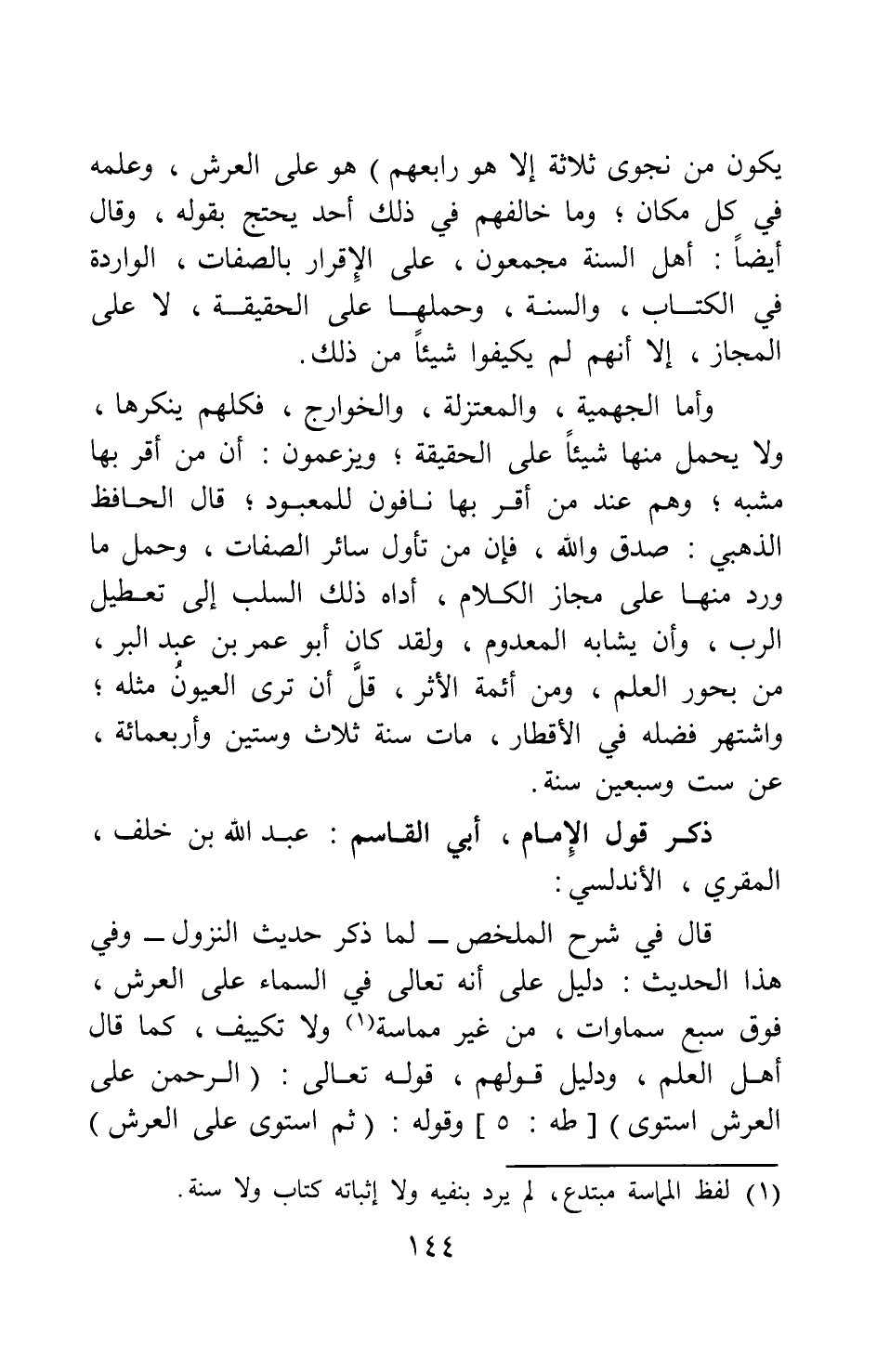 وأما الجهمية، والمعتزلة، والخوارج، فكلهم ينكرها، ولا يحمل منها شيئا على الحقيقة; ويزعمون: أن من أقر بها مشبه; وهم عند من أقر بها نافون للمعبود; قال الحافظ الذهبي: صدق والله، فإن من تأول سائر الصفات، وحمل ما ورد منها على مجاز الكلام، أداه ذلك السلب إلى تعطيل الرب، وأن يشابه المعدوم ولقد كان أبو عمر بن عبد البر، من بحور العلم، ومن أئمة الأثر، قل أن ترى العيون مثله; واشتهر فضله في الأقطار، مات سنة ثلاث وستين وأربعمائة، عن ست وسبعين سنة.