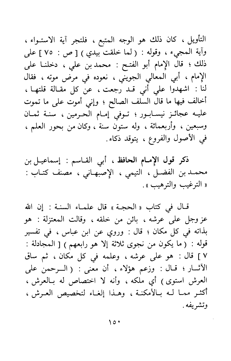قال الإمام أبو الفتح محمد بن علي: دخلنا على الإمام أبي المعالي الجويني نعوده في مرض موته، فقال لنا: اشهدوا علي أني قد رجعت عن كل مقالة قلتها أخالف فيها ما قال السلف الصالح، وإني أموت على ما تموت عليه عجائز نيسابور; توفي إمام الحرمين سنة ثمان وسبعين وأربعمائة، وله ستون سنة، وكان من بحور العلم في الأصول والفروع، يتوقد ذكاء.