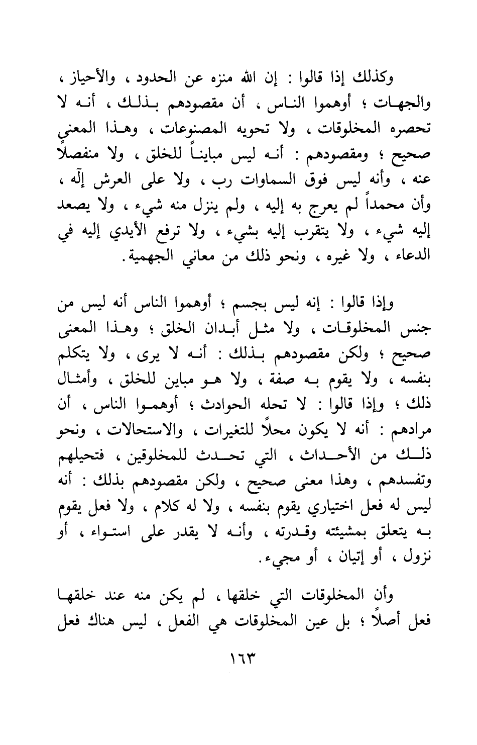 وإذا قالوا: إنه ليس بجسم، أوهموا الناس أنه ليس من جنس المخلوقات، ولا مثل أبدان الخلق; وهذا المعنى صحيح; ولكن مقصودهم بذلك أنه لا يرى، ولا يتكلم بنفسه، ولا يقوم به صفة، ولا هو مباين للخلق، وأمثال ذلك; وإذا قالوا: لا تحله الحوادث، أوهموا الناس أن مرادهم أنه لا يكون محلا للتغيرات والاستحالات، ونحو ذلك من الأحداث التي تحدث للمخلوقين، فتحيلهم وتفسدهم، وهذا معنى صحيح؛ ولكن مقصودهم بذلك أنه ليس له فعل اختياري يقوم بنفسه، ولا له كلام، ولا فعل يقوم به يتعلق بمشيئته وقدرته، وأنه لا يقدر على استواء، أو نزول، أو إتيان، أو مجيء، وأن المخلوقات التي خلقها، لم يكن منه عند خلقها فعل أصلا; بل عين المخلوقات هي الفعل، ليس هناك فعل