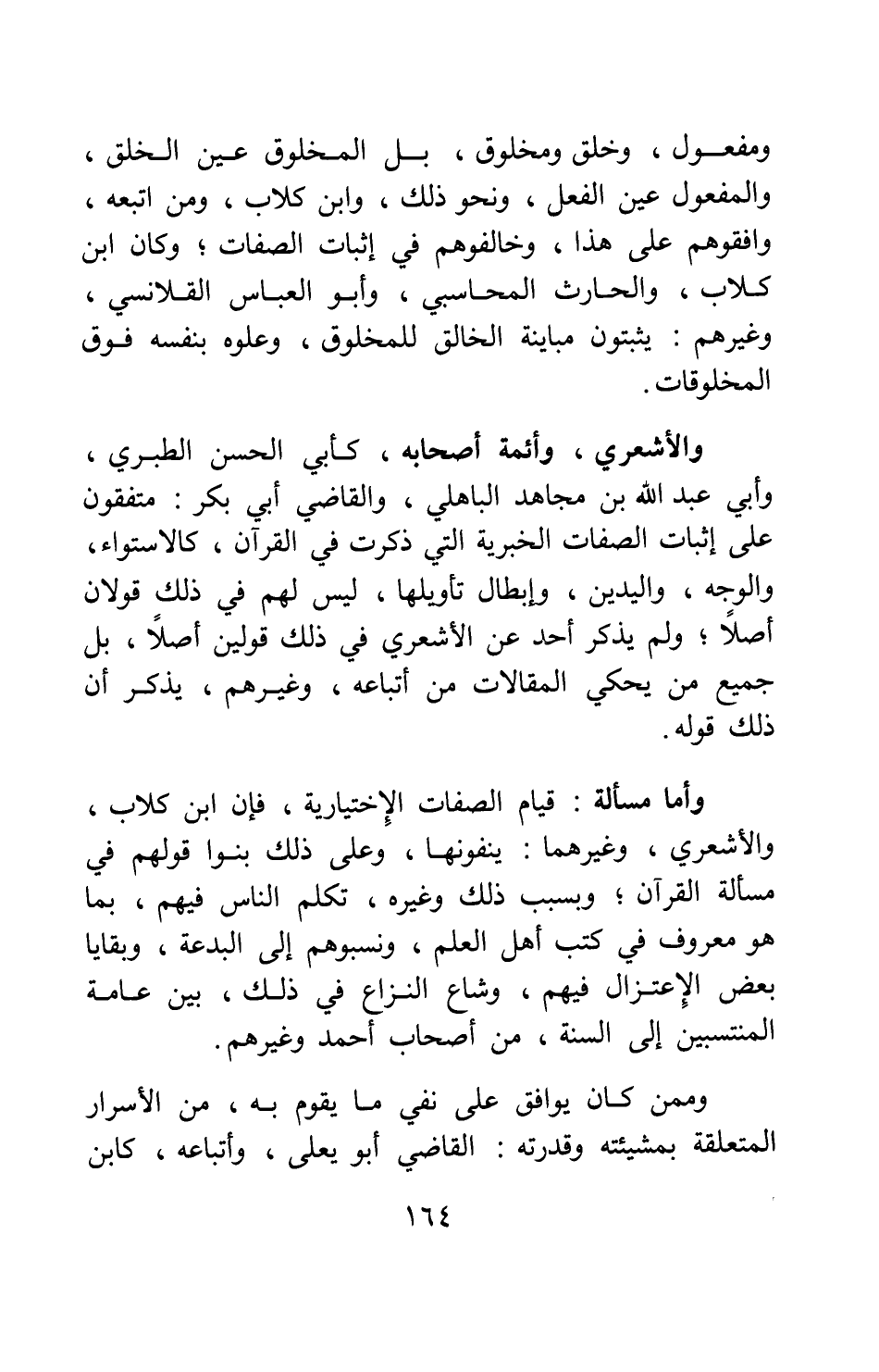 وأما مسألة: قيام الصفات الاختيارية، فإن ابن كلاب، والأشعري، وغيرهما ينفونها، وعلى ذلك بنوا قولهم في مسألة القرآن وبسبب ذلك وغيره تكلم الناس فيهم، بما هو معروف في كتب أهل العلم، ونسبوهم إلى البدعة وبقايا بعض الاعتزال فيهم، وشاع النّزاع في ذلك بين عامة المنتسبين إلى السنة من أصحاب أحمد وغيرهم.