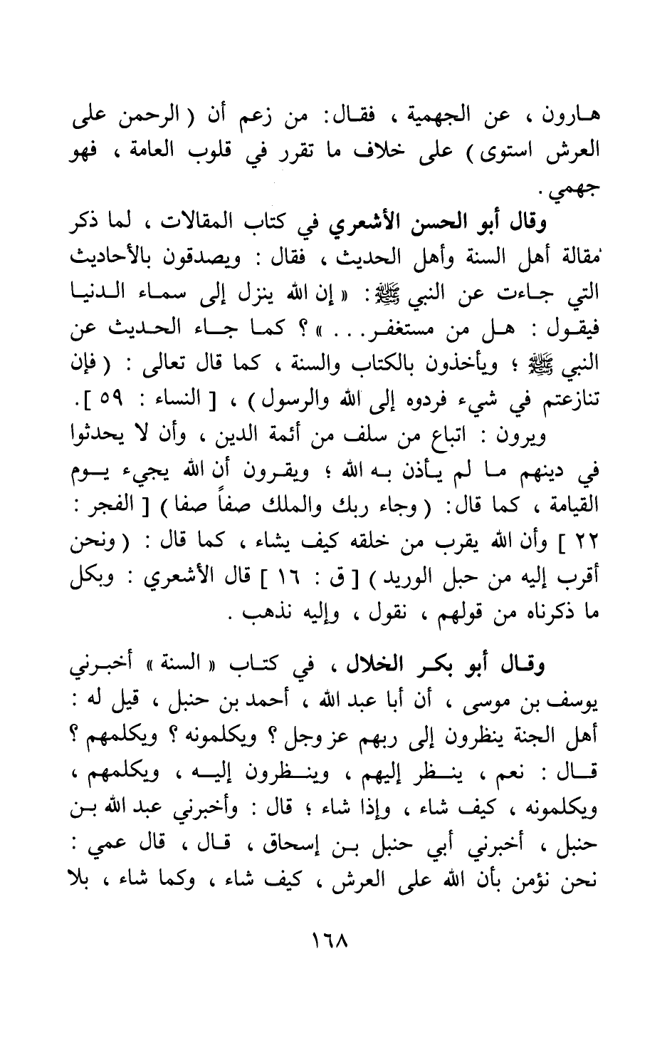 وقال أبو بكر الخلال في كتاب السنة: أخبرني يوسف بن موسى أن أبا عبد الله أحمد بن حنبل قيل له: أهل الجنة ينظرون إلى ربهم عز وجل؟ ويكلمونه؟ ويكلمهم؟ قال: نعم ينظر إليهم وينظرون إليه، ويكلمهم ويكلمونه، كيف شاء وإذا شاء. قال: وأخبرني عبد الله بن حنبل، أخبرني أبي حنبل بن إسحاق قال: قال عمي: نحن نؤمن بأن الله على العرش كيف شاء، وكما شاء، بلا