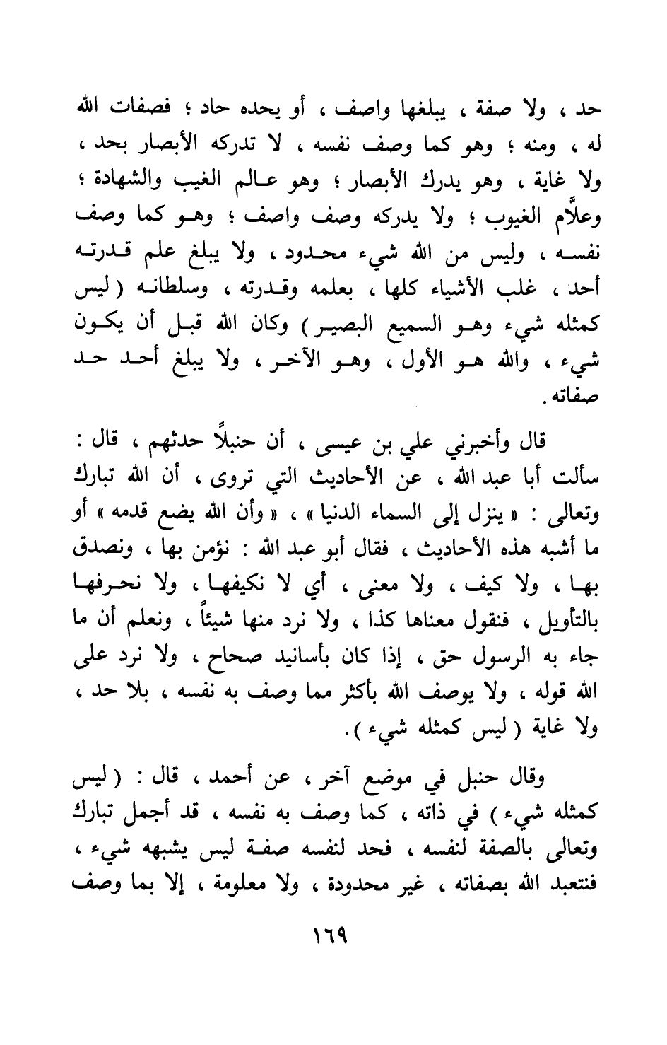 وقال حنبل في موضع آخر، عن أحمد قال: {لَيْسَ كَمِثْلِهِ شَيْءٌ} [سورة الشورى آية: 11] في ذاته، كما وصف به نفسه، قد أجمل تبارك وتعالى بالصفة لنفسه، فحد لنفسه صفة ليس يشبهه شيء، فنتعبد الله بصفاته، غير محدودة، ولا معلومة، إلا بما وصف