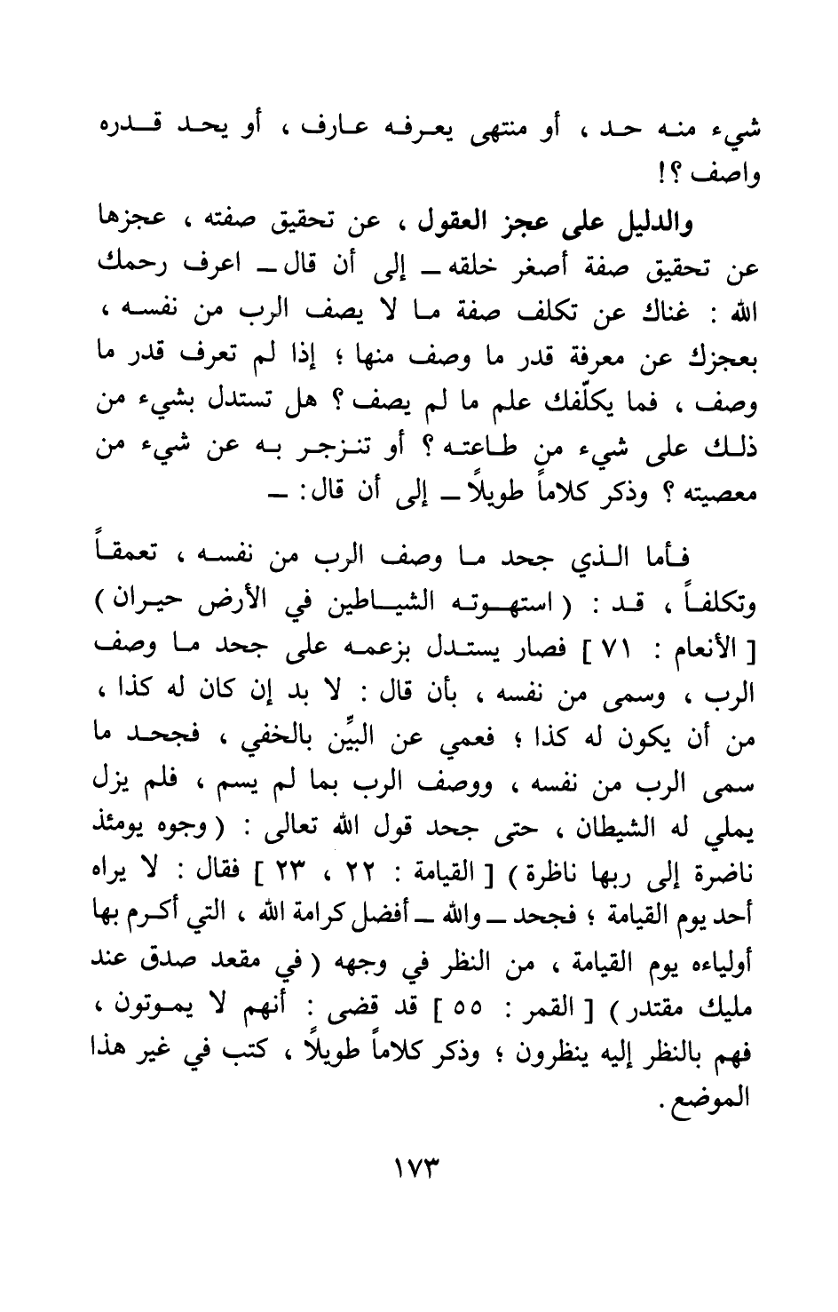 والدليل على عجز العقول عن تحقيق صفته، عجزها عن تحقيق صفة أصغر خلقه ... إلى أن قال: اعرف رحمك الله غناك عن تكلف صفة ما لا يصف الرب من نفسه، بعجزك عن معرفة قدر ما وصف منها; إذا لم تعرف قدر ما وصف، فما تكلفك علم ما لم يصف؟ هل تستدل بشيء من ذلك على شيء من طاعته؟ أو تَنْزجر به عن شيء من معصيته؟ وذكر كلاما طويلا - إلى أن قال: -