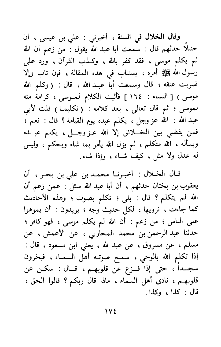وقال الخلال في السنة: أخبرني علي بن عيسى أن حنبلا حدثهم قال: سمعت أبا عبد الله يقول: من زعم أن الله لم يكلم موسى فقد كفر بالله، وكذب القرآن، ورد على رسول الله صلى الله عليه وسلم أمره، يستتاب في هذه المقالة، فإن تاب وإلا ضربت عنقه. قال: وسمعت أبا عبد الله قال: {وَكَلَّمَ اللَّهُ مُوسَى} [سورة النساء آية: 164] ، فأثبت الكلام لموسى، كرامة منه لموسى ثم قال تعالى بعد كلامه: تكليما. قلت لأبي عبد الله: الله عز وجل يكلم عبده يوم القيامة؟ قال: نعم; فمن يقضي بين الخلائق إلا الله عز وجل، يكلم عبده ويسأله، الله متكلم، لم يزل الله يأمر بما شاء ويحكم، وليس له عدل ولا مثل، كيف شاء، وإذا شاء. قال الخلال: أخبرنا محمد بن علي بن بحر، أن يعقوب بن بختان حدثهم، أن أبا عبد الله سئل: عمن زعم أن الله لم يتكلم. قال: بلى، تكلم بصوت; وهذه الأحاديث كما جاءت، نرويها، لكل حديث وجه; يريدون أن يموهوا على الناس; من زعم أن الله لم يكلم موسى، فهو كافر; حدثنا عبد الرحمن بن محمد المحاربي، عن الأعمش، عن مسلم، عن مسروق، عن عبد الله، يعني ابن مسعود، قال: "إذا تكلم الله بالوحي، سمع صوته أهل السماء، فيخرون سجدا، حتى إذا فزع عن قلوبهم، قال: سكن عن قلوبهم، نادى أهل السماء: ماذا قال ربكم؟ قالوا: الحق، قال: كذا، وكذا".