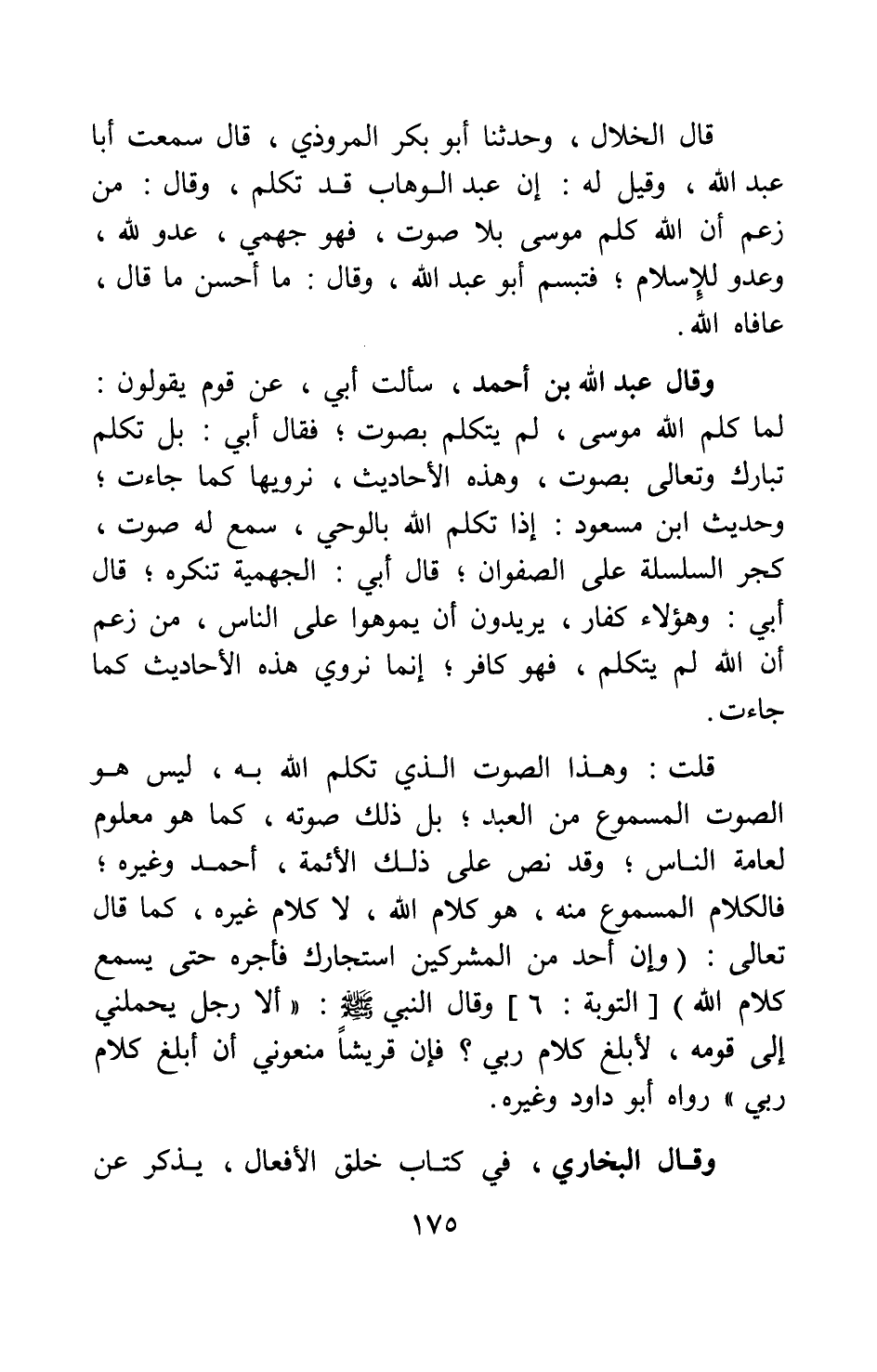 وقال عبد الله بن أحمد، سألت أبي، عن قوم يقولون: لما كلم الله موسى، لم يتكلم بصوت; فقال أبي: بل تكلم تبارك وتعالى بصوت، وهذه الأحاديث نرويها كما جاءت; وحديث ابن مسعود: إذا تكلم الله بالوحي، سمع له صوت كجر السلسلة على الصفوان ; قال أبي: الجهمية تنكره; قال أبي: وهؤلاء كفار، يريدون أن يموهوا على الناس، من زعم أن الله لم يتكلم، فهو كافر; إنما نروي هذه الأحاديث كما جاءت.