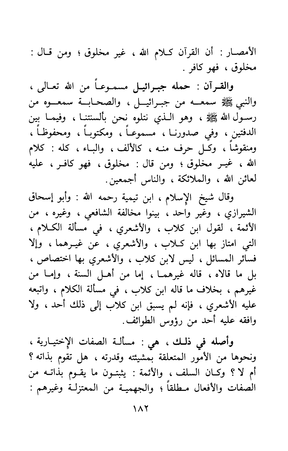 وقال شيخ الإسلام ابن تيمية رحمه الله: وأبو إسحاق الشيرازي، وغير واحد، بينوا مخالفة الشافعي، وغيره من الأئمة، لقول ابن كلاب والأشعري، في مسألة الكلام، التي امتاز بها ابن كلاب والأشعري عن غيرهما، وإلا فسائر المسائل ليس لابن كلاب والأشعري بها اختصاص، بل ما قالاه قاله غيرهما، إما من أهل السنة وإما من غيرهم، بخلاف ما قاله ابن كلاب، في مسألة الكلام، واتبعه عليه الأشعري، فإنه لم يسبق ابن كلاب إلى ذلك أحد، ولا وافقه عليه أحد من رؤوس الطوائف.