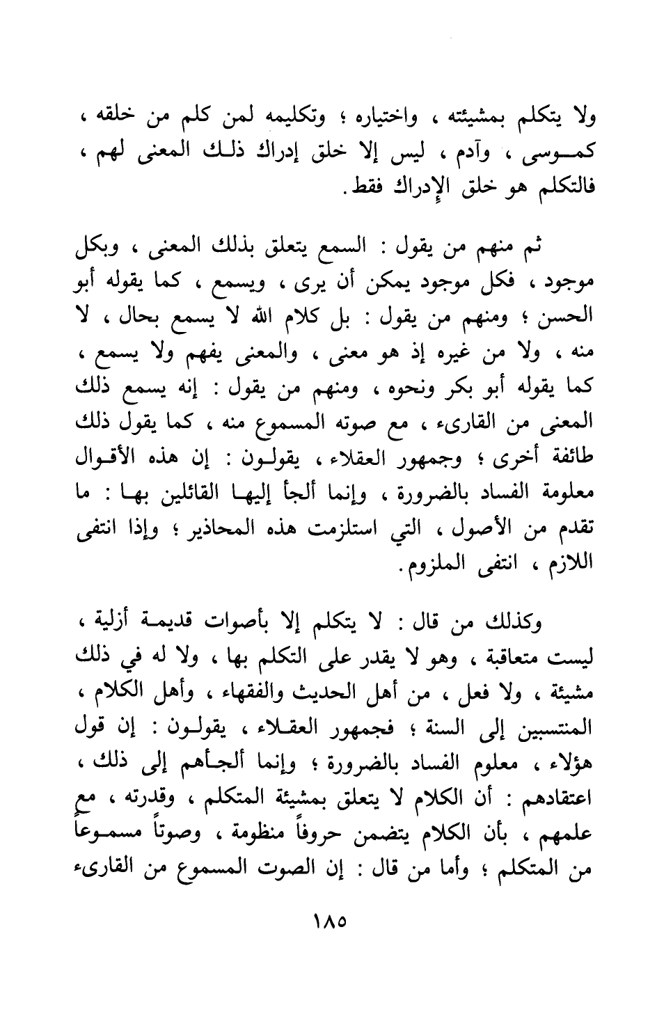 ولا يتكلم بمشيئته واختياره; وتكليمه لمن كلم من خلقه، كموسى وآدم، ليس إلا خلق إدراك ذلك المعنى لهم؛ فالتكلم هو خلق الإدراك فقط.