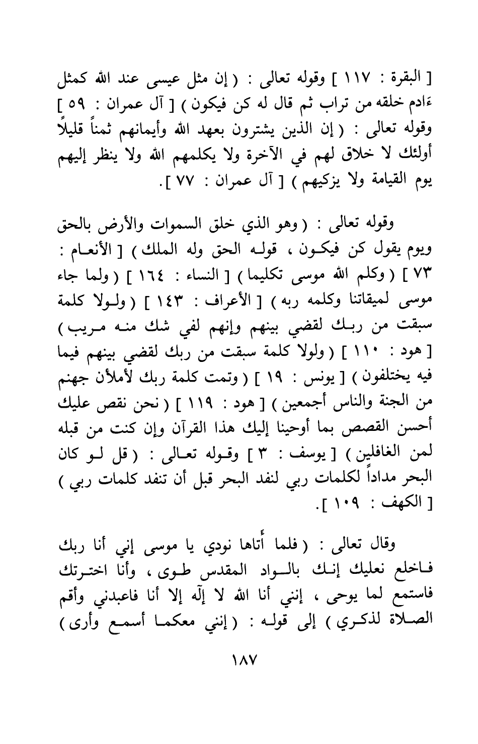وقوله تعالى: {وَهُوَ الَّذِي خَلَقَ السَّمَاوَاتِ وَالْأَرْضَ بِالْحَقِّ وَيَوْمَ يَقُولُ كُنْ فَيَكُونُ قَوْلُهُ الْحَقُّ وَلَهُ الْمُلْكُ} [سورة الأنعام آية: 73] ، {وَكَلَّمَ اللَّهُ مُوسَى تَكْلِيماً} [سورة النساء آية: 164] ، {وَلَمَّا جَاءَ مُوسَى لِمِيقَاتِنَا وَكَلَّمَهُ رَبُّهُ} [سورة الأعراف آية: 143] ، {وَلَوْلا كَلِمَةٌ سَبَقَتْ مِنْ رَبِّكَ لَقُضِيَ بَيْنَهُمْ وَإِنَّهُمْ لَفِي شَكٍّ مِنْهُ مُرِيبٍ} [سورة هود آية: 110] ، {وَلَوْلا كَلِمَةٌ سَبَقَتْ مِنْ رَبِّكَ لَقُضِيَ بَيْنَهُمْ فِيمَا فِيهِ يَخْتَلِفُونَ} [سورة يونس آية: 19] ، {وَتَمَّتْ كَلِمَةُ رَبِّكَ لَأَمْلَأَنَّ جَهَنَّمَ مِنَ الْجِنَّةِ وَالنَّاسِ أَجْمَعِينَ} [سورة هود آية: 119] ، {نَحْنُ نَقُصُّ عَلَيْكَ أَحْسَنَ الْقَصَصِ بِمَا أَوْحَيْنَا إِلَيْكَ هَذَا الْقُرْآنَ وَإِنْ كُنْتَ مِنْ قَبْلِهِ لَمِنَ الْغَافِلِينَ} [سورة يوسف آية: 3] ، وقوله تعالى: {قُلْ لَوْ كَانَ الْبَحْرُ مِدَاداً لِكَلِمَاتِ رَبِّي لَنَفِدَ الْبَحْرُ قَبْلَ أَنْ تَنْفَدَ كَلِمَاتُ رَبِّي} [سورة الكهف آية: 109] .