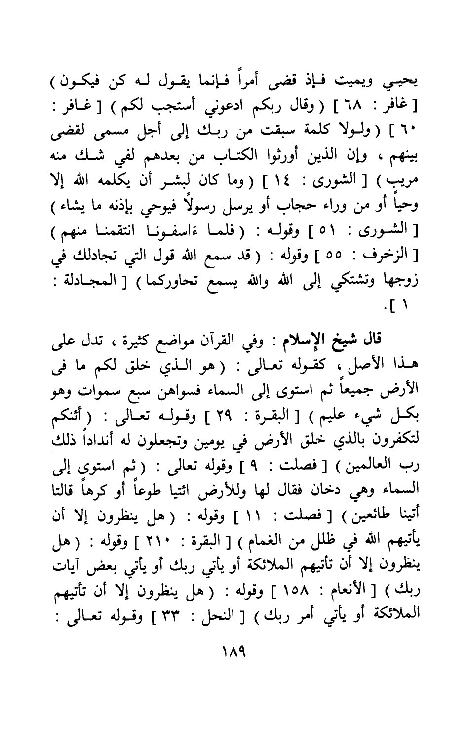 قال شيخ الإسلام: وفي القرآن مواضع كثيرة تدل على هذا الأصل، كقوله تعالى: {هُوَ الَّذِي خَلَقَ لَكُمْ مَا فِي الْأَرْضِ جَمِيعاً ثُمَّ اسْتَوَى إِلَى السَّمَاءِ فَسَوَّاهُنَّ سَبْعَ سَمَاوَاتٍ وَهُوَ بِكُلِّ شَيْءٍ عَلِيمٌ} [سورة البقرة آية: 29] ، وقوله تعالى: {أَإِنَّكُمْ لَتَكْفُرُونَ بِالَّذِي خَلَقَ الْأَرْضَ فِي يَوْمَيْنِ وَتَجْعَلُونَ لَهُ أَنْدَاداً ذَلِكَ رَبُّ الْعَالَمِينَ} [سورة فصلت آية: 9] ، وقوله تعالى: {ثُمَّ اسْتَوَى إِلَى السَّمَاءِ وَهِيَ دُخَانٌ فَقَالَ لَهَا وَلِلْأَرْضِ ائْتِيَا طَوْعاً أَوْ كَرْهاً قَالَتَا أَتَيْنَا طَائِعِينَ} [سورة فصلت آية: 11] ، وقوله: {هَلْ يَنْظُرُونَ إِلَّا أَنْ يَأْتِيَهُمُ اللَّهُ فِي ظُلَلٍ مِنَ الْغَمَامِ} [سورة البقرة آية: 210] ، وقوله: {هَلْ يَنْظُرُونَ إِلَّا أَنْ تَأْتِيَهُمُ الْمَلائِكَةُ أَوْ يَأْتِيَ رَبُّكَ أَوْ يَأْتِيَ بَعْضُ آيَاتِ رَبِّكَ} [سورة الأنعام آية: 158] ، وقوله: {هَلْ يَنْظُرُونَ إِلَّا أَنْ تَأْتِيَهُمُ الْمَلائِكَةُ أَوْ يَأْتِيَ أَمْرُ رَبِّكَ} [سورة النحل آية: 33] ، وقوله تعالى: