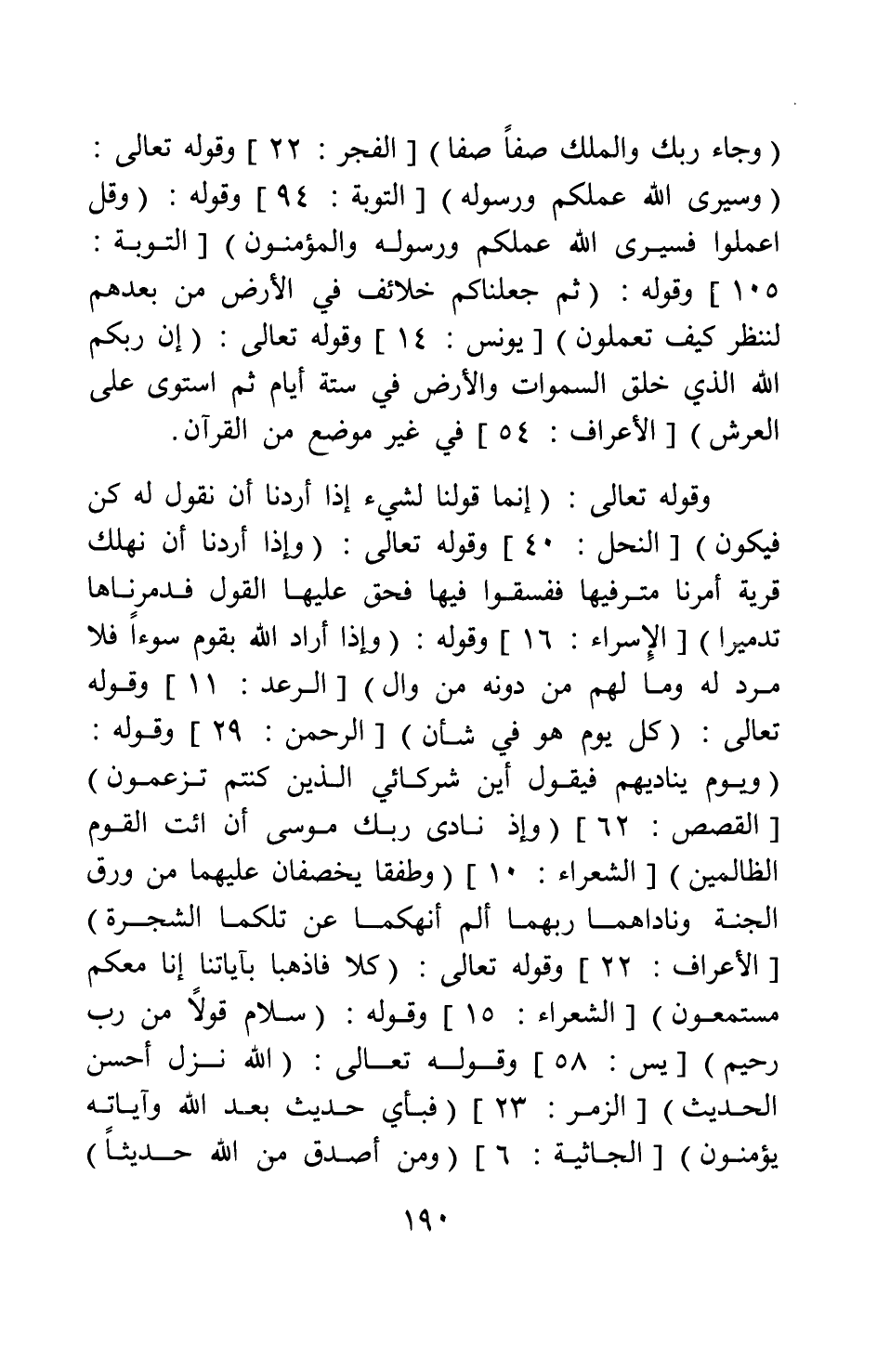 وقوله تعالى: {إِنَّمَا قَوْلُنَا لِشَيْءٍ إِذَا أَرَدْنَاهُ أَنْ نَقُولَ لَهُ كُنْ فَيَكُونُ} [سورة النحل آية: 40] ، وقوله تعالى: {وَإِذَا أَرَدْنَا أَنْ نُهْلِكَ قَرْيَةً أَمَرْنَا مُتْرَفِيهَا فَفَسَقُوا فِيهَا فَحَقَّ عَلَيْهَا الْقَوْلُ فَدَمَّرْنَاهَا تَدْمِيراً} [سورة الإسراء آية: 16] ، وقوله: {وَإِذَا أَرَادَ اللَّهُ بِقَوْمٍ سُوءاً فَلا مَرَدَّ لَهُ وَمَا لَهُمْ مِنْ دُونِهِ مِنْ وَالٍ} [سورة الرعد آية: 11] ، وقوله تعالى: {كُلَّ يَوْمٍ هُوَ فِي شَأْنٍ} [سورة الرحمن آية: 29] ، وقوله: {وَيَوْمَ يُنَادِيهِمْ فَيَقُولُ أَيْنَ شُرَكَائِيَ الَّذِينَ كُنْتُمْ تَزْعُمُونَ} [سورة القصص آية: 62] ، {وَإِذْ نَادَى رَبُّكَ مُوسَى أَنِ ائْتِ الْقَوْمَ الظَّالِمِينَ} [سورة الشعراء آية: 10] ، {وَطَفِقَا يَخْصِفَانِ عَلَيْهِمَا مِنْ وَرَقِ الْجَنَّةِ وَنَادَاهُمَا رَبُّهُمَا أَلَمْ أَنْهَكُمَا عَنْ تِلْكُمَا الشَّجَرَةِ} [سورة الأعراف آية: 22] ، وقوله تعالى: {كَلَّا فَاذْهَبَا بِآياتِنَا إِنَّا مَعَكُمْ مُسْتَمِعُونَ} [سورة الشعراء آية: 15] ، وقوله: {سَلامٌ قَوْلاً مِنْ رَبٍّ رَحِيمٍ} [سورة يس آية: 58] ، وقوله تعالى: {اللَّهُ نَزَّلَ أَحْسَنَ الْحَدِيثِ} [سورة الزمر آية: 23] ، {فَبِأَيِّ حَدِيثٍ بَعْدَ اللَّهِ وَآيَاتِهِ يُؤْمِنُونَ} [سورة الجاثية آية: 6] ، {وَمَنْ أَصْدَقُ مِنَ اللَّهِ حَدِيثاً}