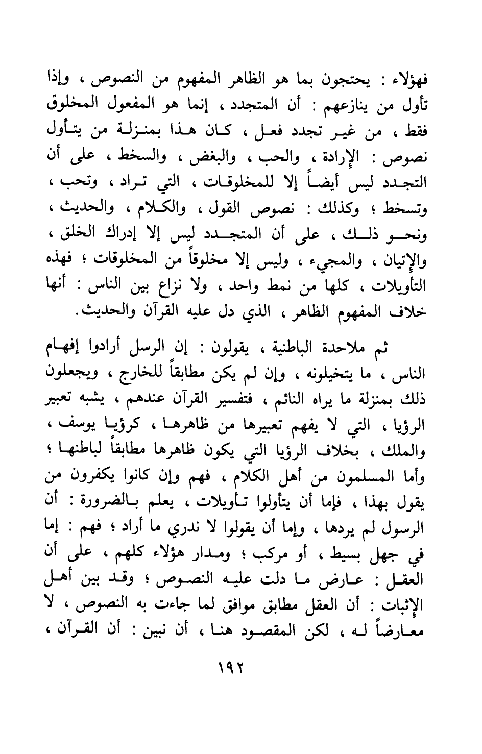 فهؤلاء يحتجون بما هو الظاهر المفهوم من النصوص، وإذا تأول من ينازعهم أن المتجدد إنما هو المفعول المخلوق فقط، من غير تجدد فعل، كان هذا بمنْزلة من يتأول نصوص الإرادة، والحب، والبغض، والسخط، على أن التجدد ليس أيضا إلا للمخلوقات التي تراد، وتحب، وتسخط; وكذلك نصوص القول، والكلام، والحديث، ونحو ذلك، على أن المتجدد ليس إلا إدراك الخلق، والإتيان، والمجيء، وليس إلا مخلوقا من المخلوقات; فهذه التأويلات كلها من نمط واحد، ولا نزاع بين الناس أنها خلاف المفهوم الظاهر الذي دل عليه القرآن والحديث.
