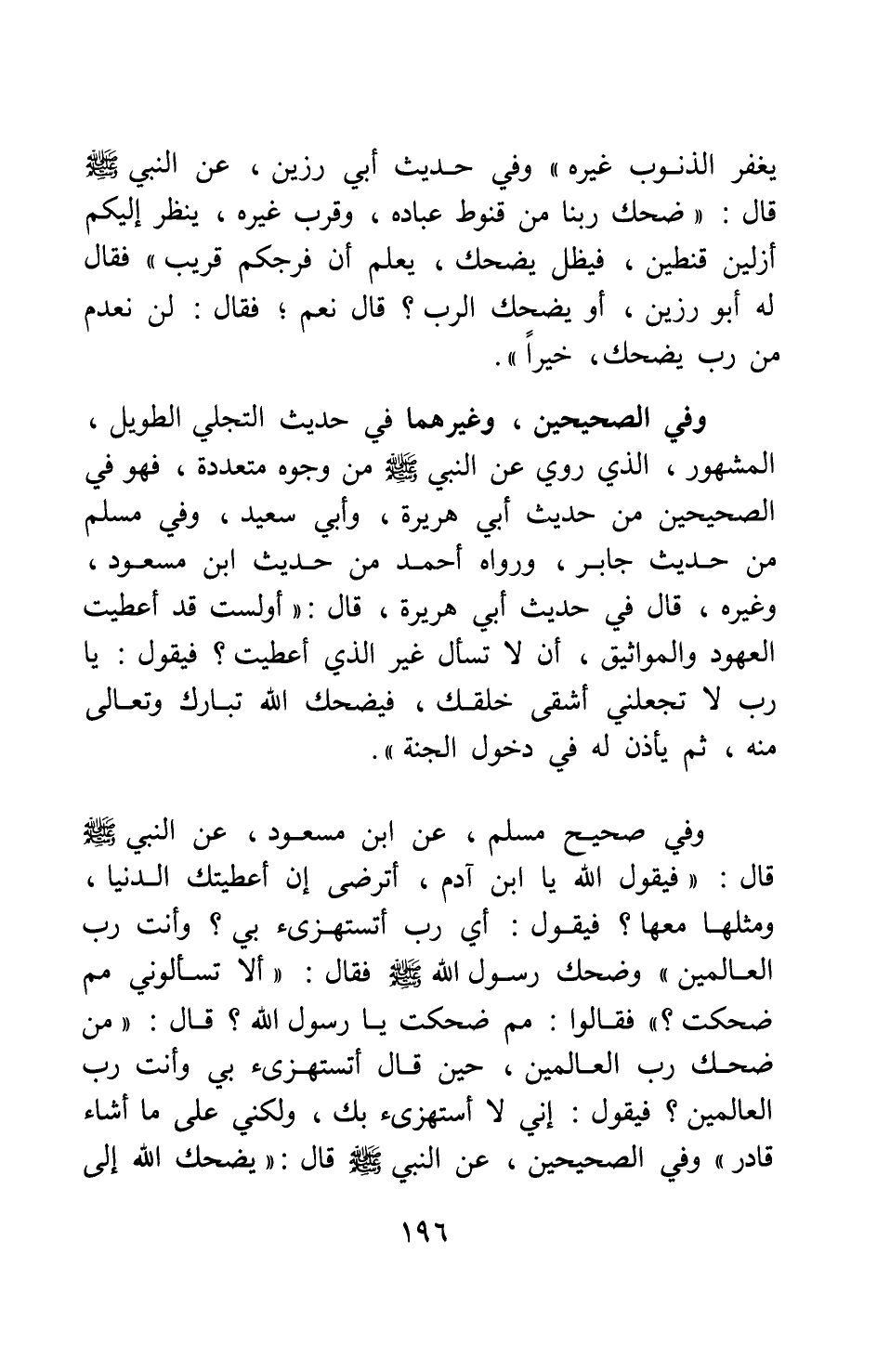 وفي صحيح مسلم، عن ابن مسعود، عن النبي صلى الله عليه وسلم قال: " فيقول الله يا ابن آدم، أترضى إن أعطيتك الدنيا، ومثلها معها؟ فيقول: أي رب أتستهزئ بي وأنت رب العالمين؟ وضحك رسول الله صلى الله عليه وسلم فقال: ألا تسألوني مم ضحكت؟ فقالوا: مم ضحكت يا رسول الله؟ قال: من ضحك رب العالمين، حين قال: أتستهزئ بي وأنت رب العالمين؟ فيقول: إني لا أستهزئ بك، ولكني على ما أشاء قادر "3 وفي الصحيحين، عن النبي صلى الله عليه وسلم قال: " يضحك الله إلى