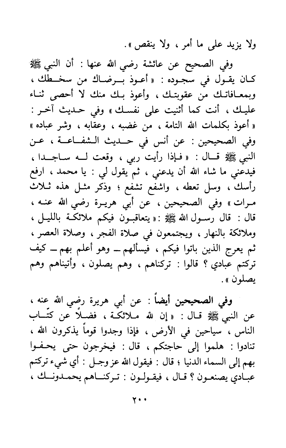 وفي الصحيح عن عائشة رضي الله عنها: أن النبي صلى الله عليه وسلم كان يقول في سجوده: " أعوذ برضاك من سخطك، وبمعافاتك من عقوبتك، وأعوذ بك منك لا أحصي ثناء عليك، أنت كما أثنيت على نفسك "2. وفي حديث آخر: " أعوذ بكلمات الله التامة، من غضبه، وعقابه، وشر عباده "3، وفي الصحيحين: عن أنس في حديث الشفاعة، عن النبي صلى الله عليه وسلم قال: "فإذا رأيت ربي وقعت له ساجدا، فيدعني ما شاء الله أن يدعني، ثم يقول لي: يا محمد، ارفع رأسك، وسل تعطه، واشفع تشفع. وذكر مثل هذه ثلاث مرات "4.