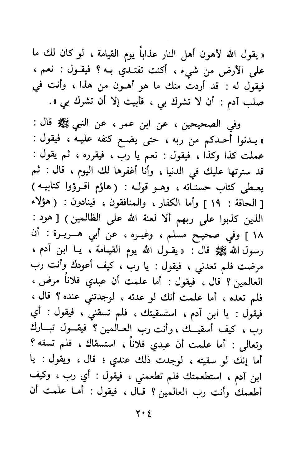 " يقول الله لأهون أهل النار عذابا يوم القيامة: لو كان لك ما على الأرض من شيء، أكنت تفتدي به؟ فيقول: نعم، فيقول له: قد أردت منك ما هو أهون من هذا، وأنت في صلب آدم: أن لا تشرك بي، فأبيت إلا أن تشرك بي "1.
