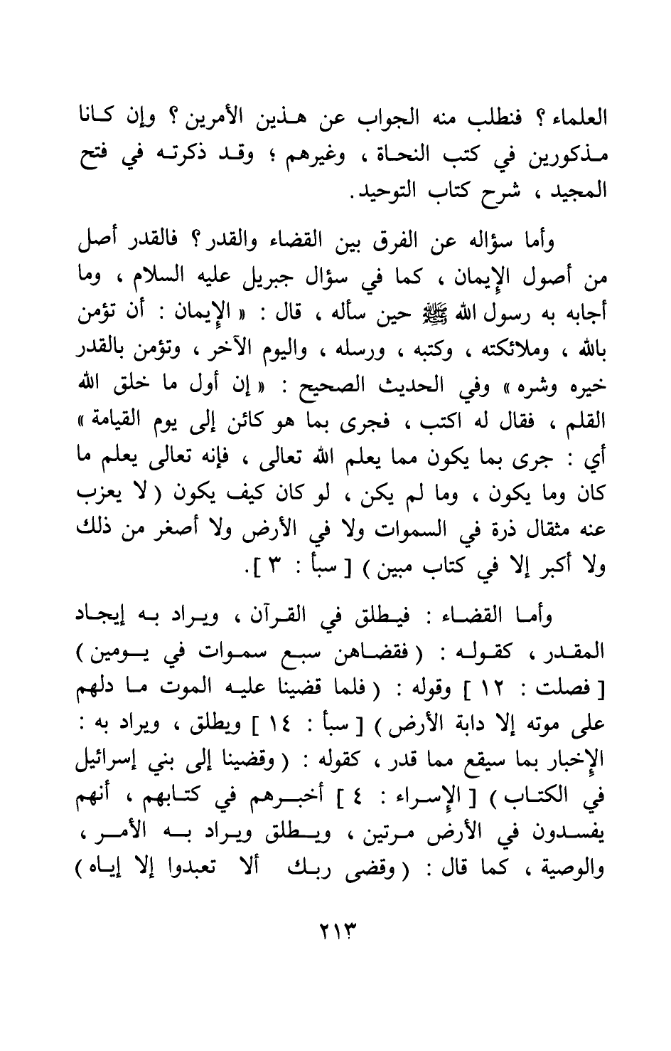 وأما القضاء: فيطلق في القرآن ويراد به إيجاد المقدر، كقوله: {فَقَضَاهُنَّ سَبْعَ سَمَاوَاتٍ فِي يَوْمَيْنِ} [سورة فصلت آية: 12] ، وقوله: {فَلَمَّا قَضَيْنَا عَلَيْهِ الْمَوْتَ مَا دَلَّهُمْ عَلَى مَوْتِهِ إِلَّا دَابَّةُ الْأَرْضِ} [سورة سبأ آية: 14] ؛ ويطلق ويراد به: الإخبار بما سيقع مما قدر، كقوله: {وَقَضَيْنَا إِلَى بَنِي إِسْرائيلَ فِي الْكِتَابِ} [سورة الإسراء آية: 4] أخبرهم في كتابهم أنهم يفسدون في الأرض مرتين؛ ويطلق ويراد به الأمر والوصية، كما قال: {وَقَضَى رَبُّكَ أَلَّا تَعْبُدُوا إِلَّا إِيَّاهُ}