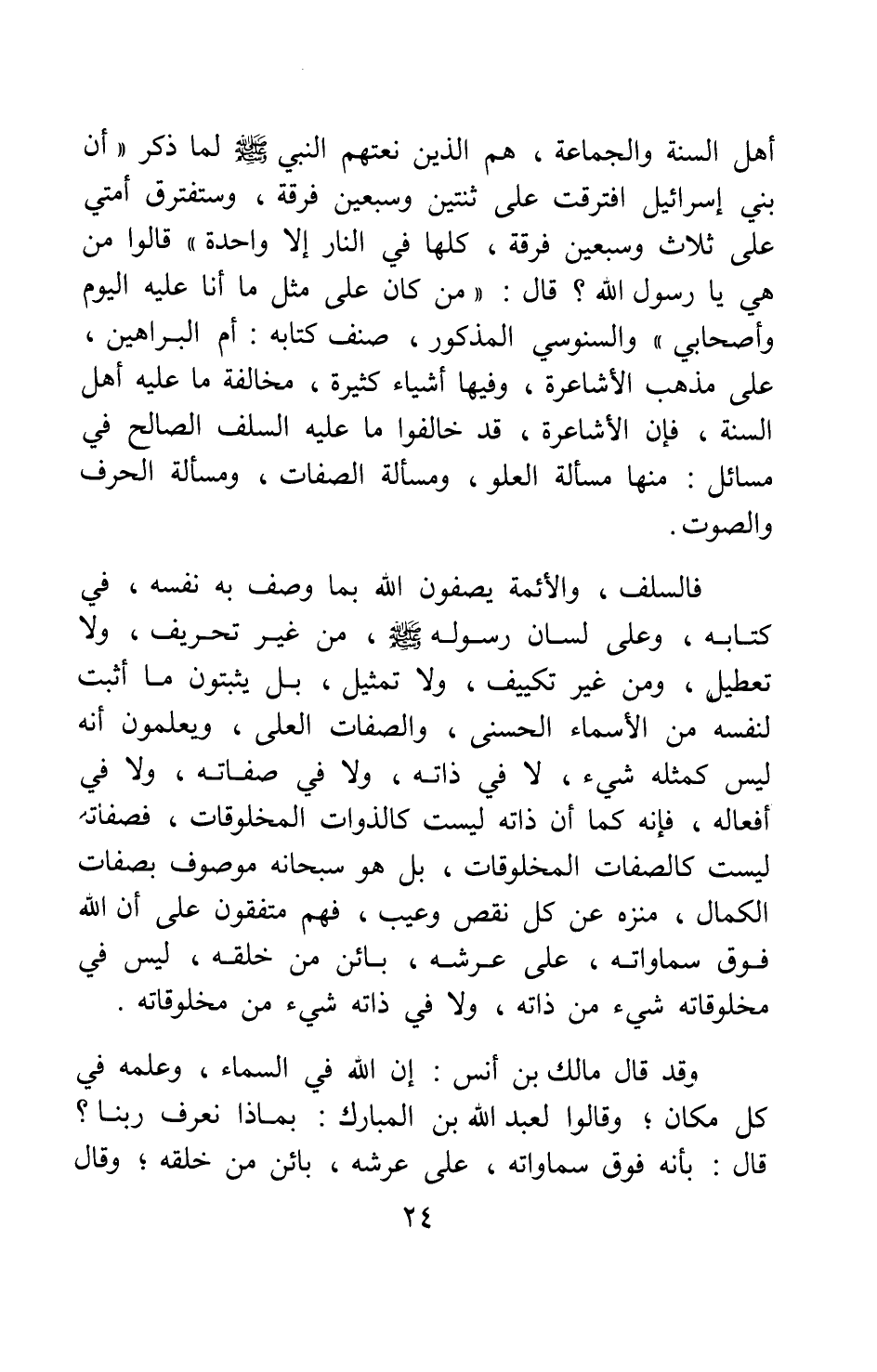 فالسلف والأئمة يصفون الله بما وصف به نفسه، في كتابه، وعلى لسان رسوله صلى الله عليه وسلم من غير تحريف، ولا تعطيل، ومن غير تكييف، ولا تمثيل، بل يثبتون ما أثبت لنفسه من الأسماء الحسنى والصفات العلى، ويعلمون أنه ليس كمثله شيء، لا في ذاته، ولا في صفاته، ولا في أفعاله؛ فإنه كما أن ذاته ليست كالذوات المخلوقات، فصفاته ليست كالصفات المخلوقات، بل هو سبحانه موصوف بصفات الكمال، منَزه عن كل نقص وعيب. فهم متفقون على أن الله فوق سمواته، على عرشه، بائن من خلقه، ليس في مخلوقاته شيء من ذاته، ولا في ذاته شيء من مخلوقاته.