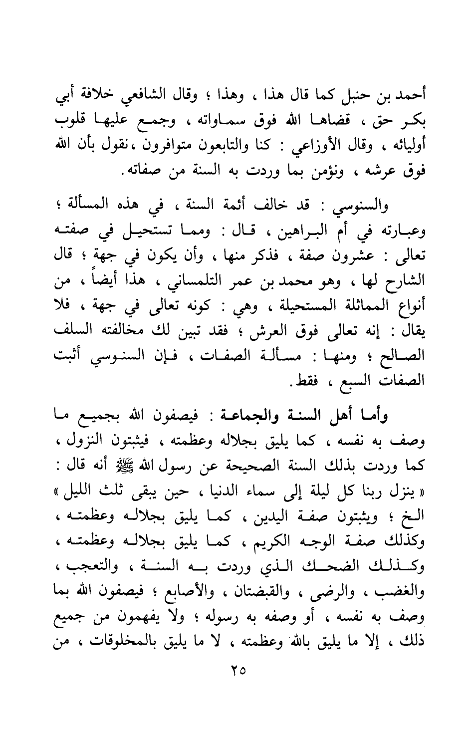 والسنوسي قد خالف أئمة السنة في هذه المسألة ; وعبارته في أم البراهين قال: ومما تستحيل في صفته تعالى عشرون صفة، فذكر منها: وأن يكون في جهة ; قال الشارح لها، وهو محمد بن عمر التلمساني: هذا أيضا من أنواع المماثلة المستحيلة، وهي كونه تعالى في جهة، فلا يقال: إنه تعالى فوق العرش ; فقد تبين لك مخالفته السلف الصالح، ومنها: مسألة الصفات، فإن السنوسي أثبت الصفات السبع فقط.