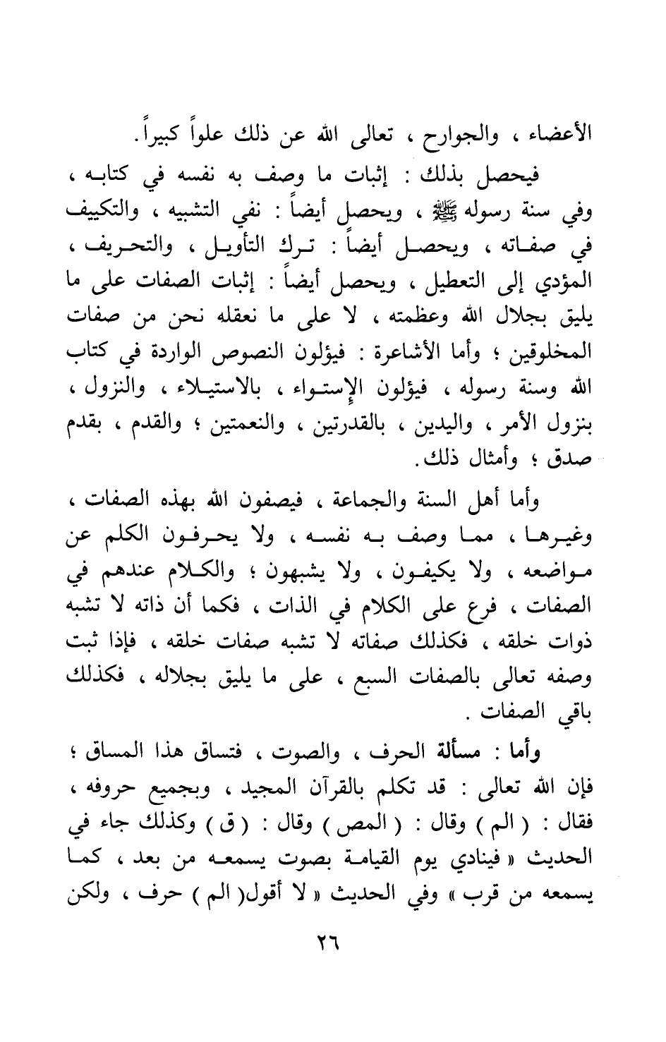 وأما أهل السنة والجماعة فيصفون الله بهذه الصفات، وغيرها، مما وصف به نفسه، ولا يحرفون الكلم عن مواضعه، ولا يكيفون، ولا يشبهون; والكلام عندهم في الصفات فرع على الكلام في الذات، فكما أن ذاته لا تشبه ذوات خلقه، فكذلك صفاته لا تشبه صفات خلقه، فإذا ثبت وصفه تعالى بالصفات السبع، على ما يليق بجلاله، فكذلك باقي الصفات.