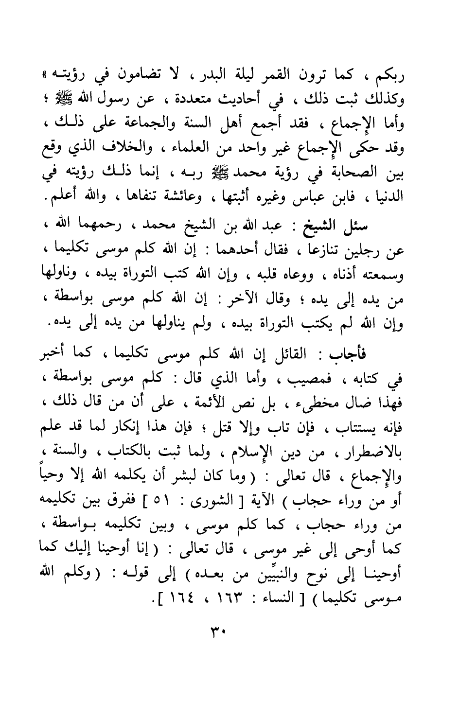 سئل الشيخ عبد الله بن الشيخ محمد، رحمهما الله، عن رجلين تنازعا، فقال أحدهما: إن الله كلم موسى تكليما، وسمعته أذناه، ووعاه قلبه، وإن الله كتب التوراة بيده، وناولها من يده إلى يده، وقال الآخر: إن الله كلم موسى بواسطة، وإن الله لم يكتب التوراة بيده، ولم يناولها من يده إلى يده.