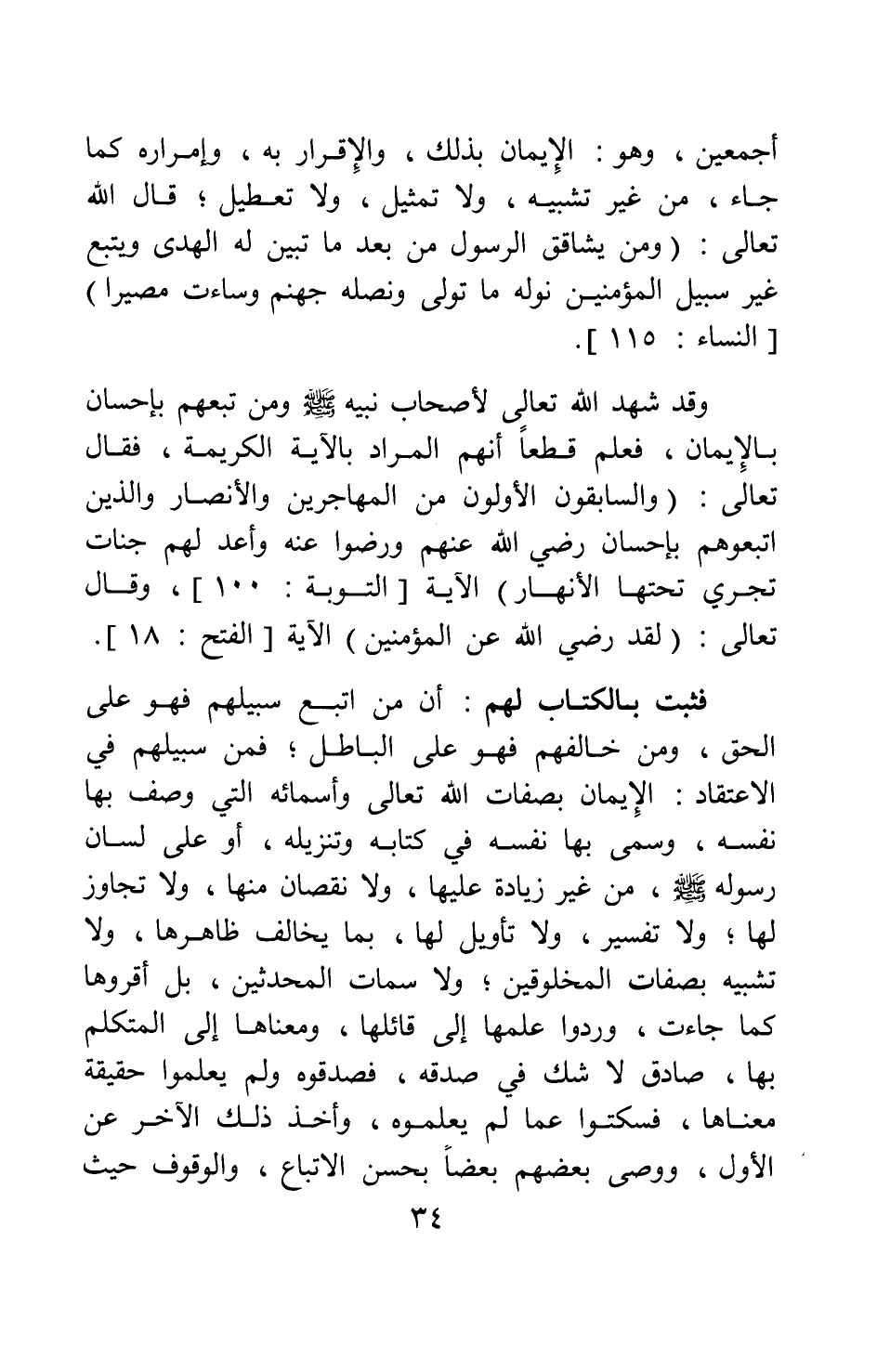 فثبت بالكتاب لهم أن من اتبع سبيلهم فهو على الحق، ومن خالفهم فهو على الباطل، فمن سبيلهم في الاعتقاد: الإيمان بصفات الله تعالى وأسمائه التي وصف بها نفسه، وسمى بها نفسه في كتابه وتنْزيله، أو على لسان رسوله صلى الله عليه وسلم من غير زيادة عليها، ولا نقصان منها، ولا تجاوز لها، ولا تفسير، ولا تأويل لها بما يخالف ظاهرها، ولا تشبيه بصفات المخلوقين، ولا سمات المحدثين؛ بل أقروها كما جاءت، وردوا علمها إلى قائلها، ومعناها إلى المتكلم بها، صادق لا شك في صدقه فصدقوه، ولم يعلموا حقيقة معناها، فسكتوا عما لم يعلموه، وأخذ ذلك الآخر عن الأول، ووصى بعضهم بعضا بحسن الاتباع، والوقوف حيث