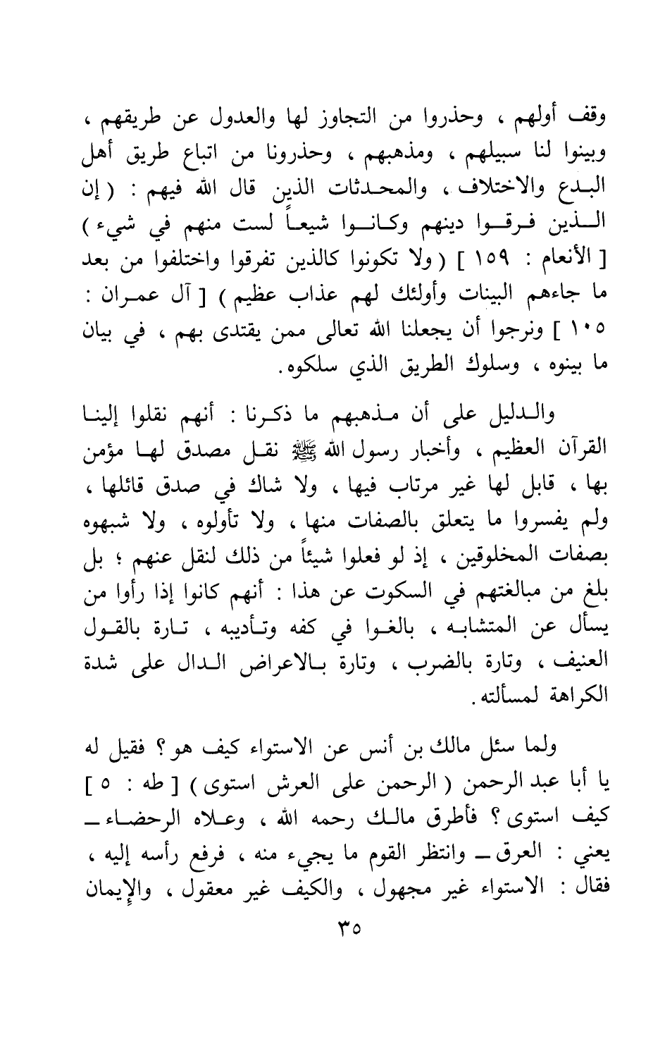 وقف أولهم، وحذروا من التجاوز لها والعدول عن طريقهم، وبينوا لنا سبيلهم ومذهبهم، وحذرونا من اتباع طريق أهل البدع والاختلاف والمحدثات الذين قال الله فيهم: {إِنَّ الَّذِينَ فَرَّقُوا دِينَهُمْ وَكَانُوا شِيَعاً لَسْتَ مِنْهُمْ فِي شَيْءٍ} [سورة الأنعام آية: 159] ، {وَلا تَكُونُوا كَالَّذِينَ تَفَرَّقُوا وَاخْتَلَفُوا مِنْ بَعْدِ مَا جَاءَهُمُ الْبَيِّنَاتُ وَأُولَئِكَ لَهُمْ عَذَابٌ عَظِيمٌ} [سورة آل عمران آية: 105] . ونرجوا أن يجعلنا الله تعالى ممن يقتدي بهم، في بيان ما بينوه، وسلوك الطريق الذي سلكوه.