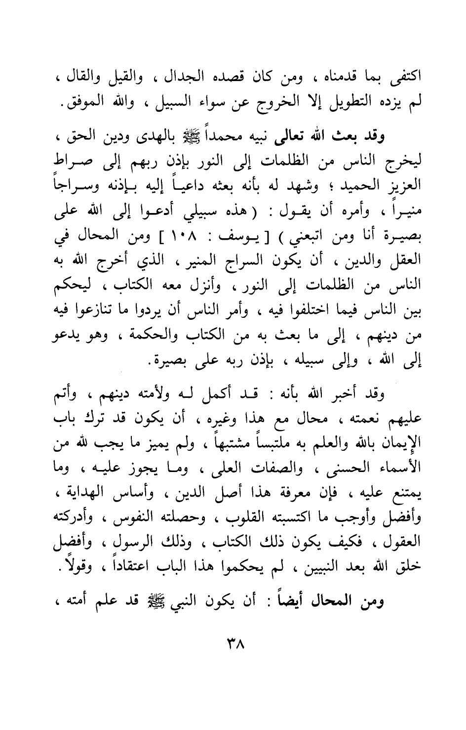 وقد بعث الله تعالى نبيه محمدا صلى الله عليه وسلم بالهدى ودين الحق، ليخرج الناس من الظلمات إلى النور بإذن ربهم إلى صراط العزيز الحميد، وشهد له بأنه بعثه داعيا إليه بإذنه وسراجا منيرا، وأمره أن يقول: {هَذِهِ سَبِيلِي أَدْعُو إِلَى اللَّهِ عَلَى بَصِيرَةٍ أَنَا وَمَنِ اتَّبَعَنِي} [سورة يوسف آية: 108] ، ومن المحال في العقل والدين، أن يكون السراج المنير، الذي أخرج الله به الناس من الظلمات إلى النور، وأنزل معه الكتاب ليحكم بين الناس فيما اختلفوا فيه، وأمر الناس أن يردوا ما تنازعوا فيه من دينهم إلى ما بعث به من الكتاب والحكمة، وهو يدعو إلى الله، وإلى سبيله، بإذن ربه على بصيرة، وقد أخبر الله بأنه قد أكمل له ولأمته دينهم، وأتم عليهم نعمته، محال مع هذا وغيره، أن يكون قد ترك باب الإيمان بالله والعلم به ملتبسا مشتبها، ولم يميز ما يجب لله من الأسماء الحسنى والصفات العلى، وما يجوز عليه، وما يمتنع عليه؛ فإن معرفة هذا أصل الدين، وأساس الهداية، وأفضل وأوجب ما اكتسبته القلوب، وحصلته النفوس، وأدركته العقول، فكيف يكون ذلك الكتاب وذلك الرسول، وأفضل خلق الله بعد النبيين، لم يحكموا هذا الباب اعتقادا، وقولا؟!
