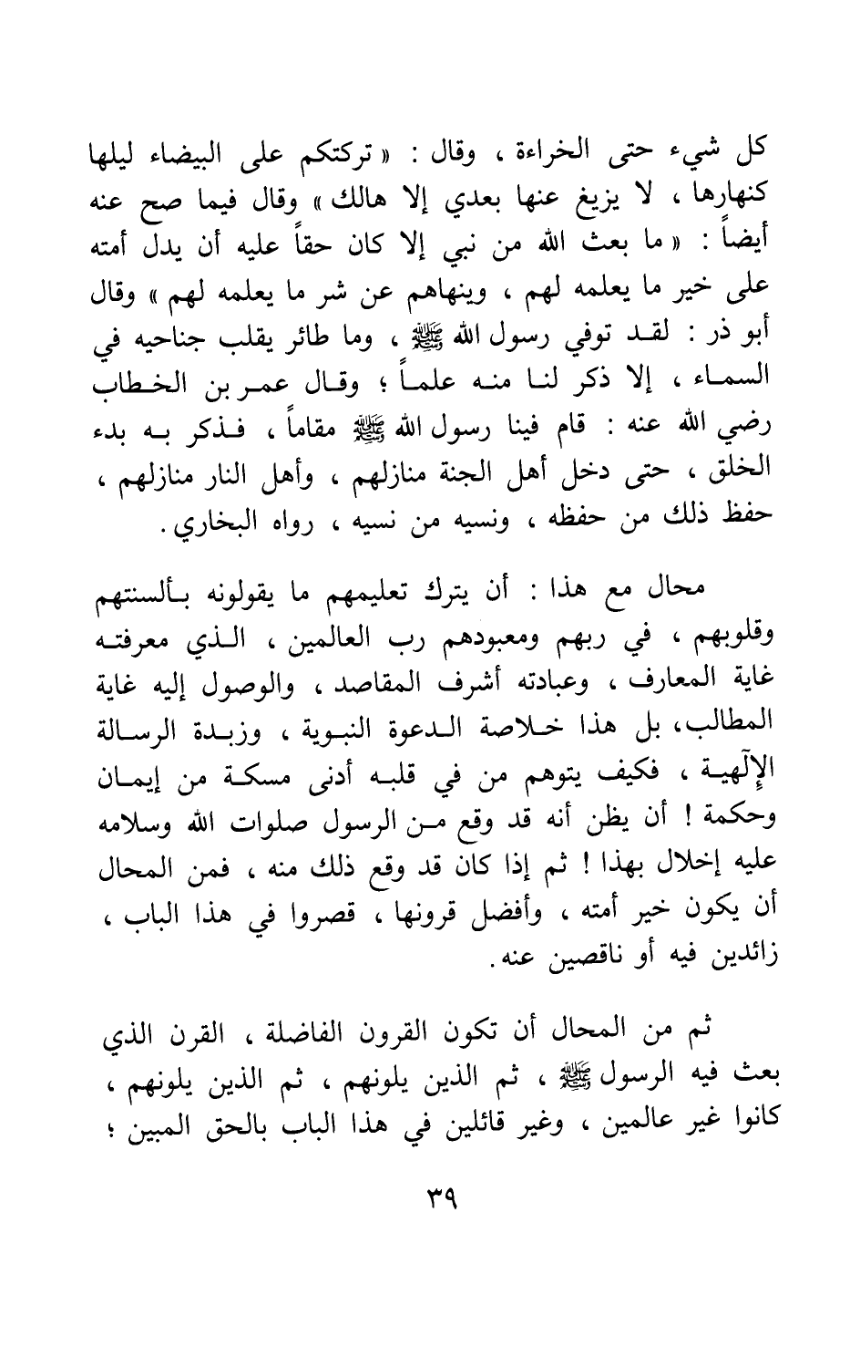 ثم من المحال أن تكون القرون الفاضلة، القرن الذي بعث فيه الرسول صلى الله عليه وسلم ثم الذين يلونهم، ثم الذين يلونهم، كانوا غير عالمين، وغير قائلين في هذا الباب بالحق المبين،