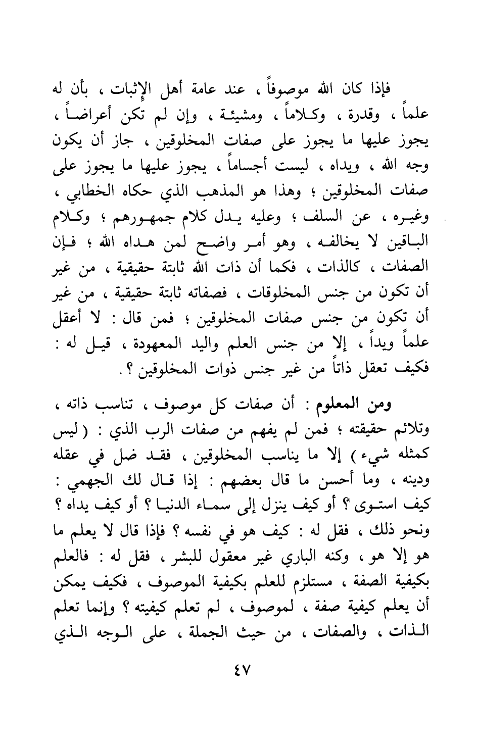 ومن المعلوم: أن صفات كل موصوف تناسب ذاته، وتلائم حقيقته، فمن لم يفهم من صفات الرب الذي: {لَيْسَ كَمِثْلِهِ شَيْءٌ} [سورة الشورى آية: 11] إلا ما يناسب المخلوقين، فقد ضل في عقله ودينه. وما أحسن ما قال بعضهم: إذا قال لك الجهمي: كيف استوى؟ أو كيف ينْزل إلى سماء الدنيا؟ أو كيف يداه؟ ونحو ذلك، فقل له: كيف هو في نفسه؟ فإذا قال: لا يعلم ما هو إلا هو، وكنه الباري غير معقول للبشر، فقل له: فالعلم بكيفية الصفة مستلزم للعلم بكيفية الموصوف، فكيف يمكن أن يعلم كيفية صفة لموصوف لم تعلم كيفيته؟ وإنما تعلم الذات والصفات من حيث الجملة، على الوجه الذي
