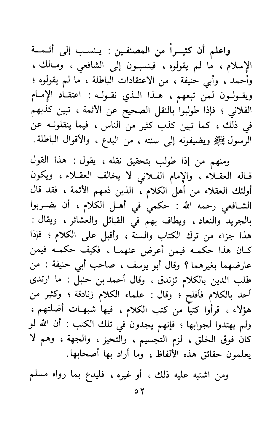 واعلم أن كثيرا من المصنفين ينسب إلى أئمة الإسلام ما لم يقولوه، فينسبون إلى الشافعي، ومالك، وأحمد، وأبي حنيفة، من الاعتقادات الباطلة ما لم يقولوه، ويقولون لمن تبعهم: هذا الذي نقوله اعتقاد الإمام الفلاني، فإذا طولبوا بالنقل الصحيح عن الأئمة، تبين كذبهم في ذلك، كما تبين كذب كثير من الناس فيما ينقلونه عن الرسول صلى الله عليه وسلم ويضيفونه إلى سنته، من البدع، والأقوال الباطلة.