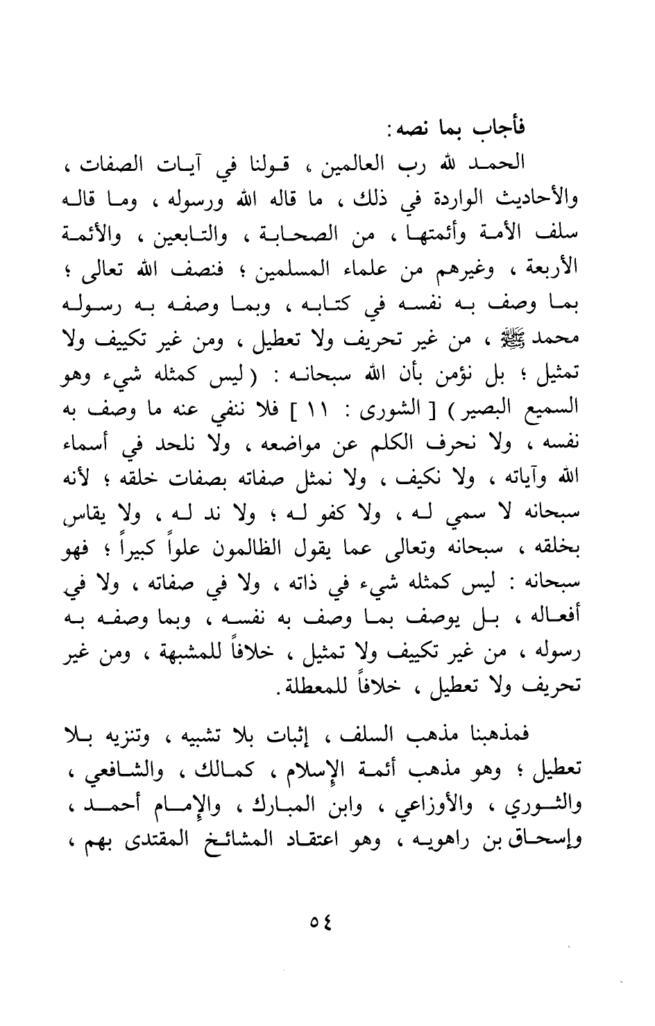 فمذهبنا مذهب السلف: إثبات بلا تشبيه، وتنْزيه بلا تعطيل، وهو مذهب أئمة الإسلام، كمالك، والشافعي، والثوري، والأوزاعي، وابن المبارك، والإمام أحمد، وإسحاق بن راهويه، وهو اعتقاد المشايخ المقتدى بهم،