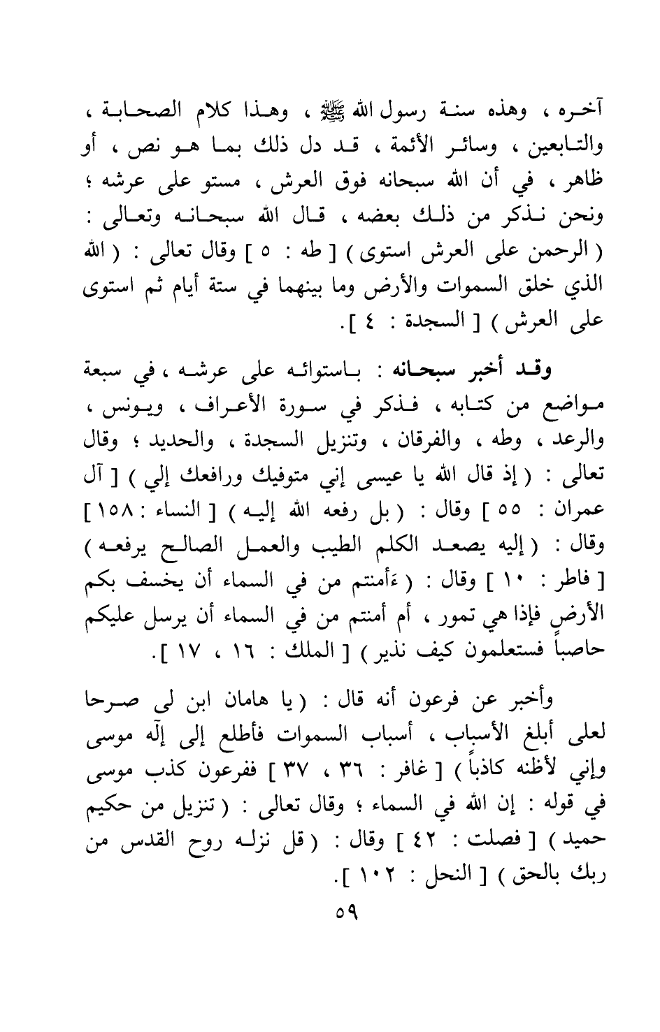 آخره، وهذه سنة رسول الله صلى الله عليه وسلم، وهذا كلام الصحابة والتابعين وسائر الأئمة، قد دل ذلك بما هو نص، أو ظاهر، في أن الله سبحانه فوق العرش، مستو على عرشه، ونحن نذكر من ذلك بعضه، قال الله سبحانه وتعالى: {الرَّحْمَنُ عَلَى الْعَرْشِ اسْتَوَى} [سورة طه آية: 5] وقال تعالى: {اللَّهُ الَّذِي خَلَقَ السَّمَاوَاتِ وَالْأَرْضَ وَمَا بَيْنَهُمَا فِي سِتَّةِ أَيَّامٍ ثُمَّ اسْتَوَى عَلَى الْعَرْشِ} [سورة السجدة آية: 4] .
