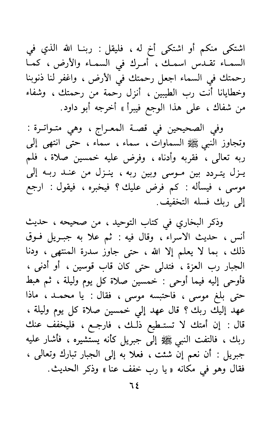 وذكر البخاري في كتاب التوحيد من صحيحه، حديث أنس، حديث الإسراء، وقال فيه: " ثم علا به جبريل فوق ذلك، بما لا يعلم إلا الله، حتى جاوز سدرة المنتهى، ودنا الجبار رب العزة، فتدلى حتى كان قاب قوسين أو أدنى، فأوحى إليه فيما أوحى خمسين صلاة كل يوم وليلة، ثم هبط حتى بلغ موسى، فاحتبسه موسى، فقال: يا محمد، ماذا عهد إليك ربك؟ قال عهد إلي خمسين صلاة كل يوم وليلة، قال: إن أمتك لا تستطيع ذلك، فارجع، فليخفف عنك ربك، فالتفت النبي صلى الله عليه وسلم إلى جبريل كأنه يستشيره، فأشار عليه جبريل: أن نعم إن شئت، فعلا به إلى الجبار تبارك وتعالى، فقال وهو في مكانه: يا رب خفف عنا "2 وذكر الحديث.