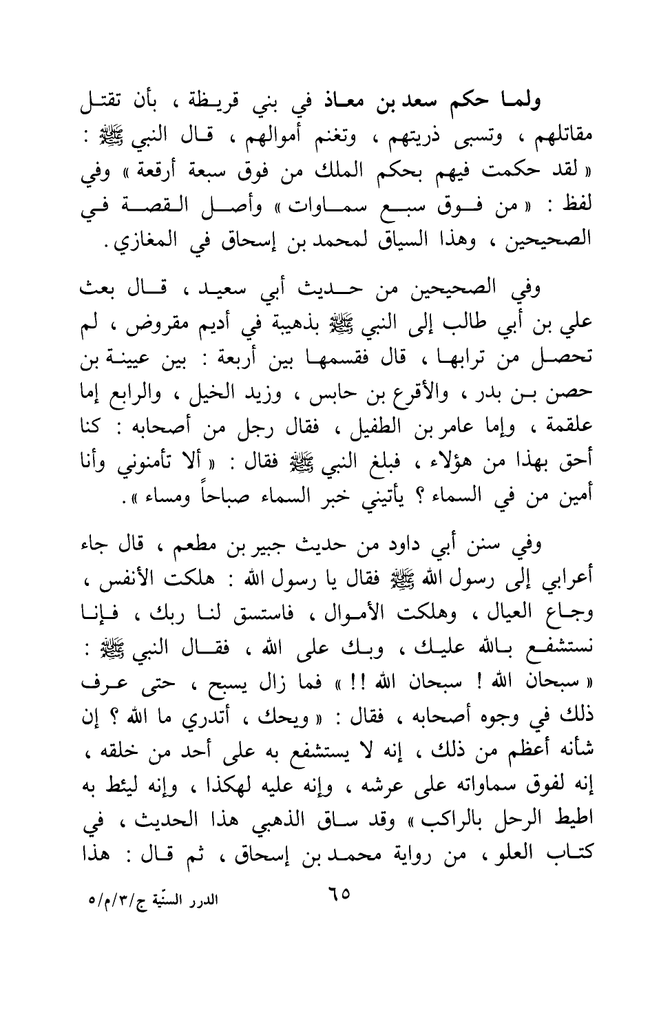 وفي سنن أبي داود من حديث جبير بن مطعم، قال: "جاء أعرابي إلى رسول الله صلى الله عليه وسلم فقال: يا رسول الله هلكت الأنفس، وجاع العيال، وهلكت الأموال، فاستسق لنا ربك، فإنا نستشفع بالله عليك، وبك على الله، فقال النبي صلى الله عليه وسلم: سبحان الله! سبحان الله! ! فما زال يسبح، حتى عرف ذلك في وجوه أصحابه، فقال: ويحك! أتدري ما الله؟ إن شأنه أعظم من ذلك، إنه لا يستشفع به على أحد من خلقه، إنه لفوق سماواته على عرشه، وإنه عليه لهكذا، وإنه ليئط به أطيط الرحل بالراكب"، وقد ساق الذهبي هذا الحديث في كتاب العلو، من رواية محمد بن إسحاق، ثم قال: هذا