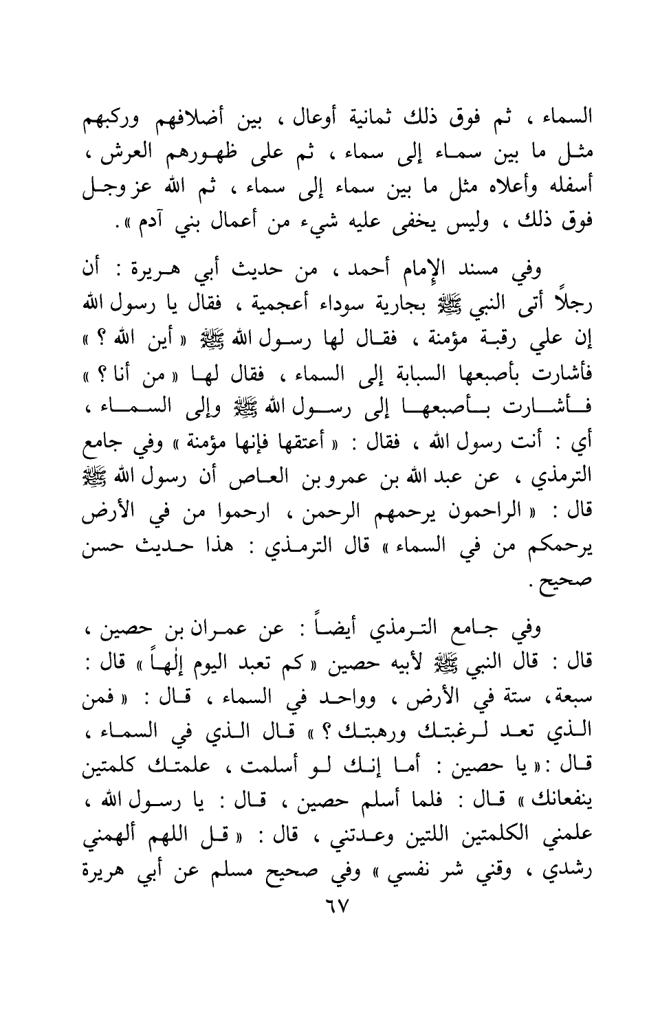 وفي جامع الترمذي أيضا عن عمران بن حصين، قال: قال النبي صلى الله عليه وسلم لأبيه حصين: " كم تعبد اليوم إلها قال: سبعة، ستة في الأرض، وواحد في السماء، قال: فمن الذي تعد لرغبتك ورهبتك؟ قال الذي في السماء، قال: يا حصين أما إنك لو أسلمت، علمتك كلمتين ينفعانك. قال: فلما أسلم حصين، قال: يا رسول الله، علمني الكلمتين اللتين وعدتني، قال: قل اللهم ألهمني رشدي، وقني شر نفسي "4 وفي صحيح مسلم عن أبي هريرة