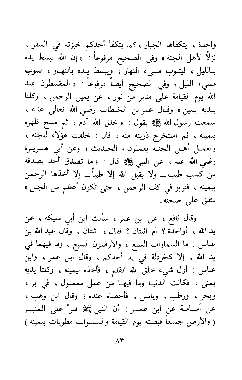 واحدة، يتكفاها الجبار، كما يتكفأ أحدكم خبزته في السفر، نزلا لأهل الجنة "1، وفي الصحيح مرفوعا: " إن الله يبسط يده بالليل، ليتوب مسيء النهار، ويبسط يده بالنهار ليتوب مسيء الليل "2، وفي الصحيح أيضا مرفوعا: " المقسطون عند الله يوم القيامة على منابر من نور عن يمين الرحمن، وكلتا يديه يمين "3، وقال عمر بن الخطاب رضي الله تعالى عنه: سمعت رسول الله صلى الله عليه وسلم يقول: " خلق الله آدم، ثم مسح ظهره بيمينه، ثم استخرج ذريته منه، قال: خلقت هؤلاء للجنة، وبعمل أهل الجنة يعملون "4 الحديث، وعن أبي هريرة رضي الله عنه عن النبي صلى الله عليه وسلم قال: " ما تصدق أحد بصدقة من كسب طيب - ولا يقبل الله إلا طيبا - إلا أخذها الرحمن بيمينه، فتربو في كف الرحمن، حتى تكون أعظم من الجبل "5 متفق على صحته.