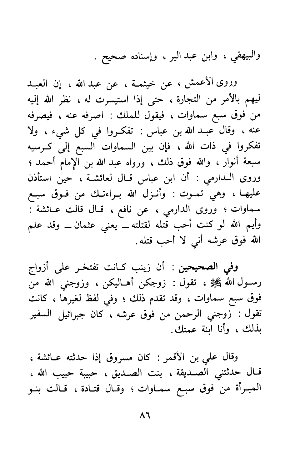 وروى الأعمش عن خيثمة عن عبد الله إن العبد ليهم بالأمر من التجارة، حتى إذا استيسرت له، نظر الله إليه من فوق سبع سماوات، فيقول للملَك: اصرفه عنه، فيصرفه عنه. وقال عبد الله بن عباس: "تفكروا في كل شيء، ولا تفكروا في ذات الله، فإن بين السماوات السبع إلى كرسيه سبعة أنوار، والله فوق ذلك" ورواه عبد الله بن الإمام أحمد، وروى الدارمي: أن ابن عباس قال لعائشة، حين استأذن عليها، وهي تموت: "وأنزل الله براءتك من فوق سبع سماوات"، وروى الدارمي عن نافع قال: قالت عائشة: "وأيم الله لو كنت أحب قتله لقتلته - يعني عثمان - وقد علم الله فوق عرشه أني لا أحب قتله".