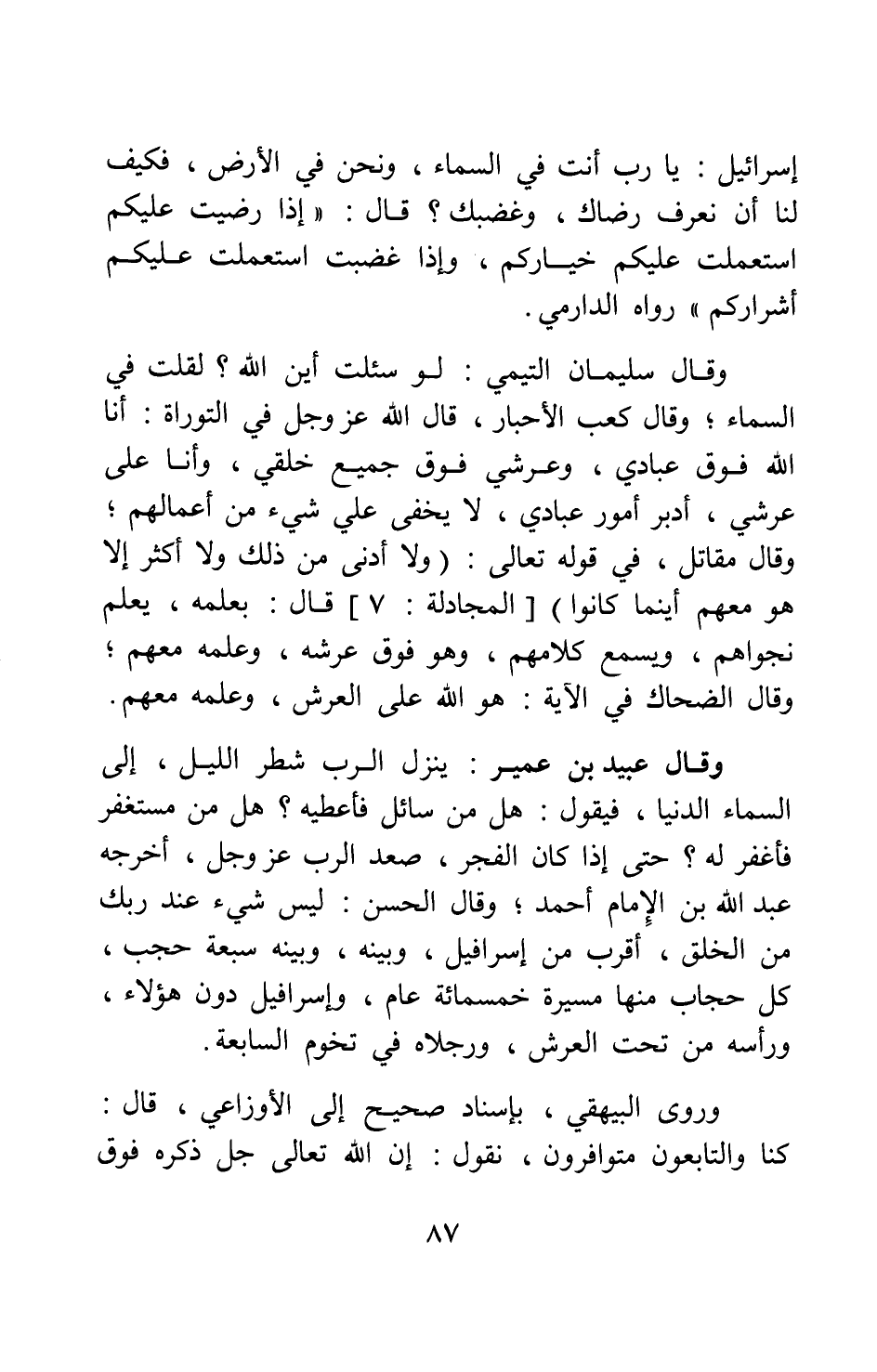 وروى البيهقي بإسناد صحيح إلى الأوزاعي قال: "كنا والتابعون متوافرون، نقول: إن الله تعالى جل ذكره فوق