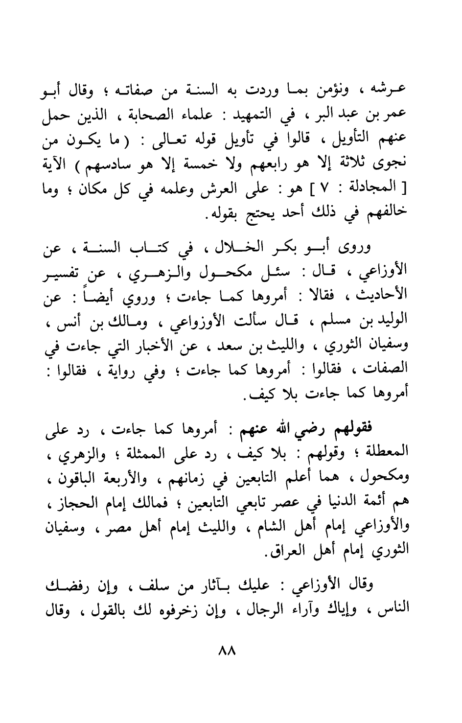 وروى أبو بكر الخلال، في كتاب السنة، عن الأوزاعي، قال: سئل مكحول والزهري، عن تفسير الأحاديث، فقالا: "أمروها كما جاءت" ; وروي أيضا: عن الوليد بن مسلم، قال سألت الأوزاعي، ومالك بن أنس، وسفيان الثوري، والليث بن سعد، عن الأخبار التي جاءت في الصفات، فقالوا: أمروها كما جاءت، وفي رواية، فقالوا: "أمروها كما جاءت بلا كيف".
