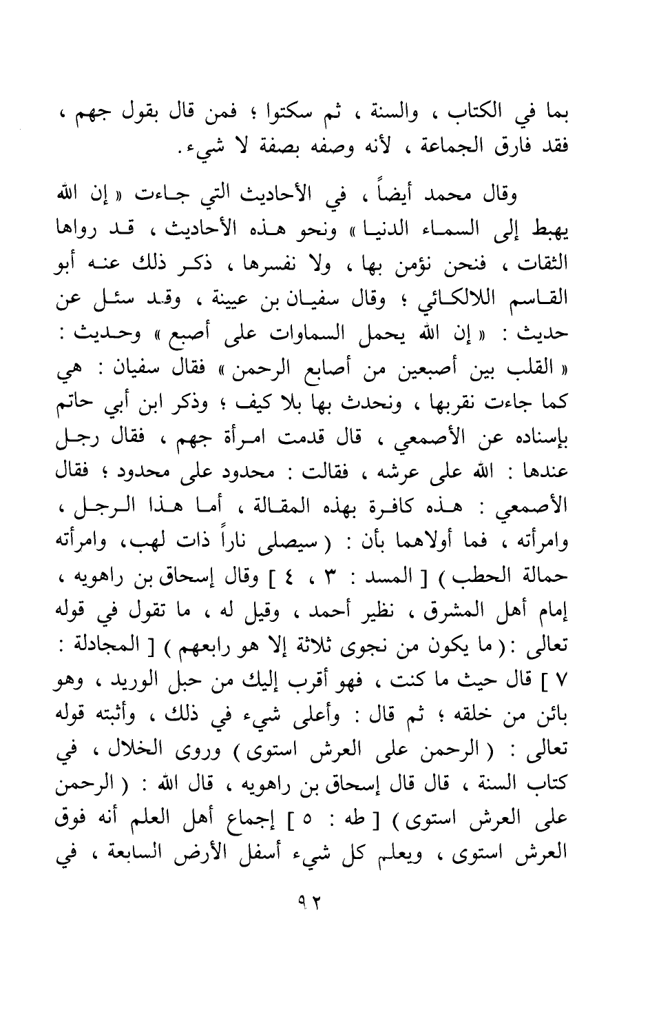 وقال محمد أيضا في الأحاديث التي جاءت: "إن الله يهبط إلي السماء الدنيا" ونحو هذه الأحاديث، قد رواها الثقات، فنحن نؤمن بها، ولا نفسرها، ذكر ذلك عنه أبو القاسم اللالكائي، وقال سفيان بن عيينة وقد سئل عن حديث: " إن الله يحمل السماوات على أصبع " وحديث: " القلب بين أصبعين من أصابع الرحمن "1 فقال سفيان: هي كما جاءت نقر بها، ونحدث بها بلا كيف، وذكر ابن أبي حاتم بإسناده عن الأصمعي قال: قدمت امرأة جهم، فقال رجل عندها: الله على عرشه، فقالت: محدود على محدود، فقال الأصمعي: هذه كافرة بهذه المقالة. أما هذا الرجل وامرأته فما أولاهما بأن: {سَيَصْلَى نَاراً ذَاتَ لَهَبٍ وَامْرَأَتُهُ حَمَّالَةَ الْحَطَبِ} [سورة المسد آية: 3-4] وقال إسحاق بن راهويه إمام أهل المشرق، نظير أحمد، وقيل له: ما تقول في قوله تعالى: {مَا يَكُونُ مِنْ نَجْوَى ثَلاثَةٍ إِلَّا هُوَ رَابِعُهُمْ} [سورة المجادلة آية: 7] ، قال: حيث ما كنت فهو أقرب إليك من حبل الوريد، وهو بائن من خلقه، ثم قال: وأعلى شيء في ذلك وأثبته قوله تعالى: {الرَّحْمَنُ عَلَى الْعَرْشِ اسْتَوَى} [سورة طه آية: 5] وروى الخلال في كتاب السنة، قال: قال إسحاق بن راهويه، قال الله: {الرَّحْمَنُ عَلَى الْعَرْشِ اسْتَوَى} [سورة طه آية: 5] : إجماع أهل العلم أنه فوق العرش استوى، ويعلم كل شيء أسفل الأرض السابعة، في