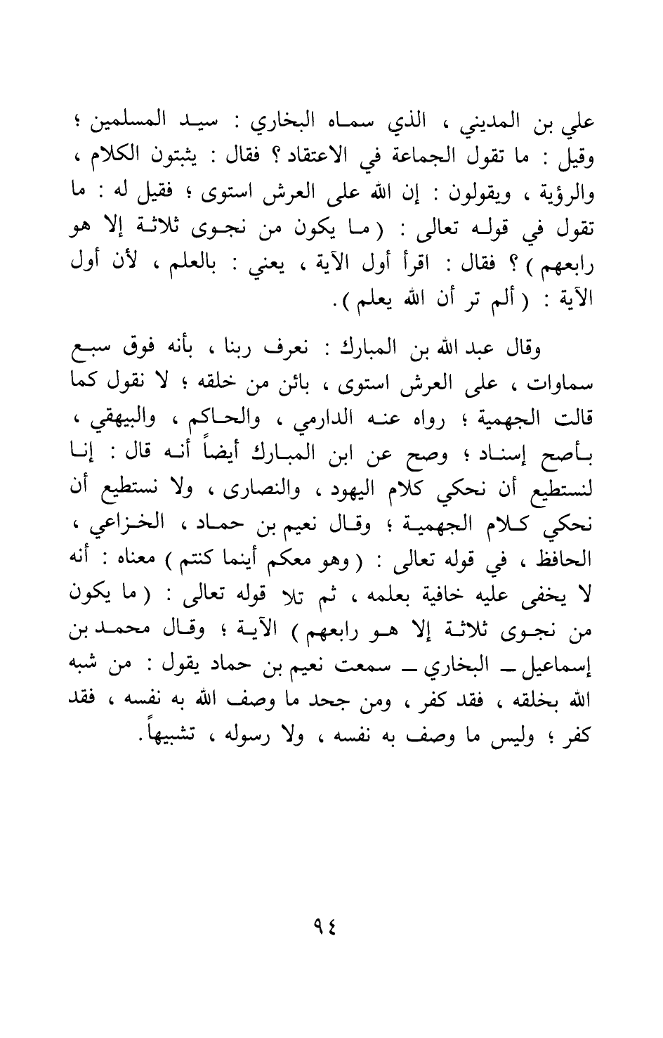 علي بن المديني الذي سماه البخاري: سيد المسلمين، وقيل: ما تقول الجماعة في الاعتقاد؟ فقال: يثبتون الكلام، والرؤية، ويقولون: إن الله على العرش استوى. فقيل له: ما تقول في قوله تعالى: {مَا يَكُونُ مِنْ نَجْوَى ثَلاثَةٍ إِلَّا هُوَ رَابِعُهُمْ} [سورة المجادلة آية: 7] فقال: اقرأ أول الآية، يعني: بالعلم، لأن أول الآية: {أَلَمْ تَرَ أَنَّ اللَّهَ يَعْلَمُ} [سورة المجادلة آية: 7] .