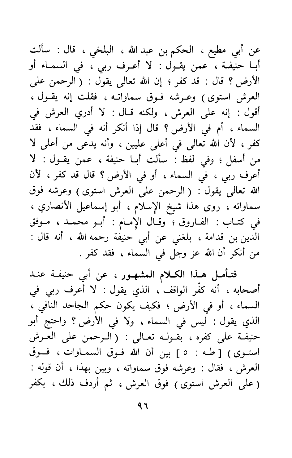 عن أبي مطيع الحكم بن عبد الله البلخي قال: سألت أبا حنيفة، عمن يقول: لا أعرف ربي، في السماء أو الأرض؟ قال: قد كفر. إن الله تعالى يقول: {الرَّحْمَنُ عَلَى الْعَرْشِ اسْتَوَى} [سورة طه آية: 5] ، وعرشه فوق سماواته، فقلت: إنه يقول: أقول: إنه على العرش، ولكنه قال: لا أدري العرش في السماء، أم في الأرض؟ قال إذا أنكر أنه في السماء، فقد كفر، لأن الله تعالى في أعلى عليين، وأنه يدعى من أعلى لا من أسفل. وفي لفظ: سألت أبا حنيفة عمن يقول: لا أعرف ربي، في السماء أو في الأرض؟ قال: قد كفر، لأن الله تعالى يقول: {الرَّحْمَنُ عَلَى الْعَرْشِ اسْتَوَى} [سورة طه آية: 5] ، وعرشه فوق سماواته، روى هذا شيخ الإسلام، أبو إسماعيل الأنصاري في كتاب: الفاروق ; وقال الإمام: أبو محمد موفق الدين بن قدامة: بلغني عن أبي حنيفة رحمه الله، أنه قال: من أنكر أن الله عز وجل في السماء، فقد كفر.