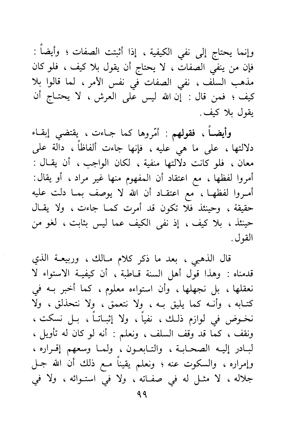 وإنما يحتاج إلى نفي الكيفية إذا أثبتت الصفات ; وأيضا فإن من ينفي الصفات لا يحتاج أن يقول بلا كيف، فلو كان مذهب السلف نفي الصفات في نفس الأمر لما قالوا بلا كيف ; فمن قال: إن الله ليس على العرش، لا يحتاج أن يقول بلا كيف.