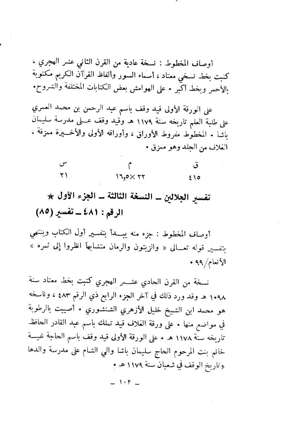 أوصاف المخطوط: جزء منه يبدأ بتفسير أول الكتاب وينتهي بتفسير قوله تعالى «وَالزَّيْتُونَ وَالرُّمَّانَ مُشْتَبِهاً وَغَيْرَ مُتَشابِهٍ انْظُرُوا إِلى ثَمَرِهِ» الأنعام/ 99.