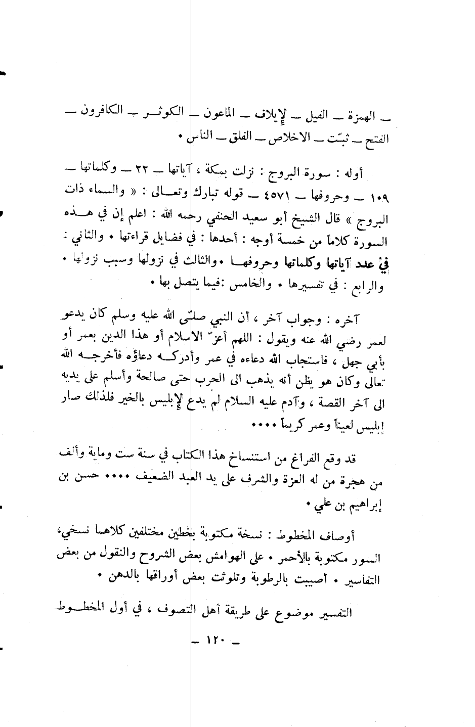 أوله: سورة البروج: نزلت بمكة، آياتها- 22 - وكلماتها- 109 - وحروفها- 4571 - قوله تبارك وتعالى: «وَالسَّماءِ ذاتِ الْبُرُوجِ» قال الشيخ أبو سعيد الحنفي رحمه الله: اعلم إن في هذه السورة كلاما من خمسة أوجه: أحدها: في فضائل قراءتها. والثاني: